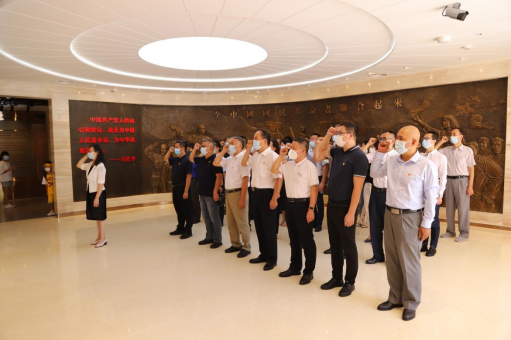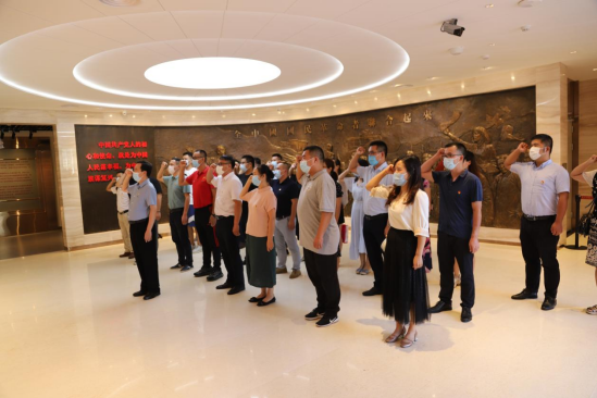 “我志愿加入中國共產(chǎn)黨,擁護(hù)黨的綱領(lǐng),遵守黨的章程……”參觀完畢后,在紀(jì)念館大廳,參觀學(xué)習(xí)的兩批黨員干部分別在黃學(xué)茭、黨委副書記魯巖領(lǐng)誓下,面向鮮紅的中國共產(chǎn)黨黨旗,舉起右拳,重溫入黨誓詞。