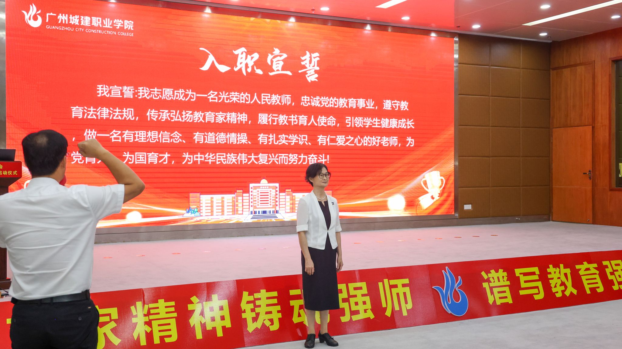 在鄢維峰的領(lǐng)誓下,黃學(xué)茭監(jiān)督新入職教師進行宣誓。莊嚴的誓言中,深刻表達了踐行教育家精神,投身教育事業(yè)、恪守教師職業(yè)規(guī)范的堅定承諾。