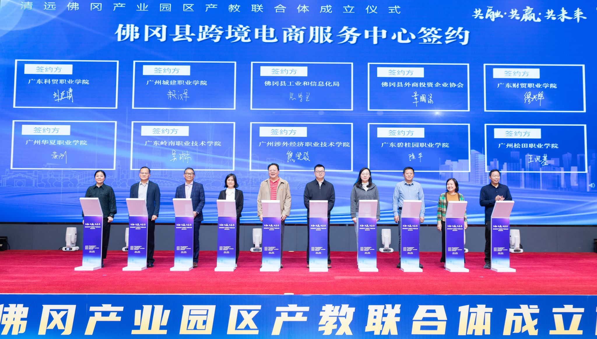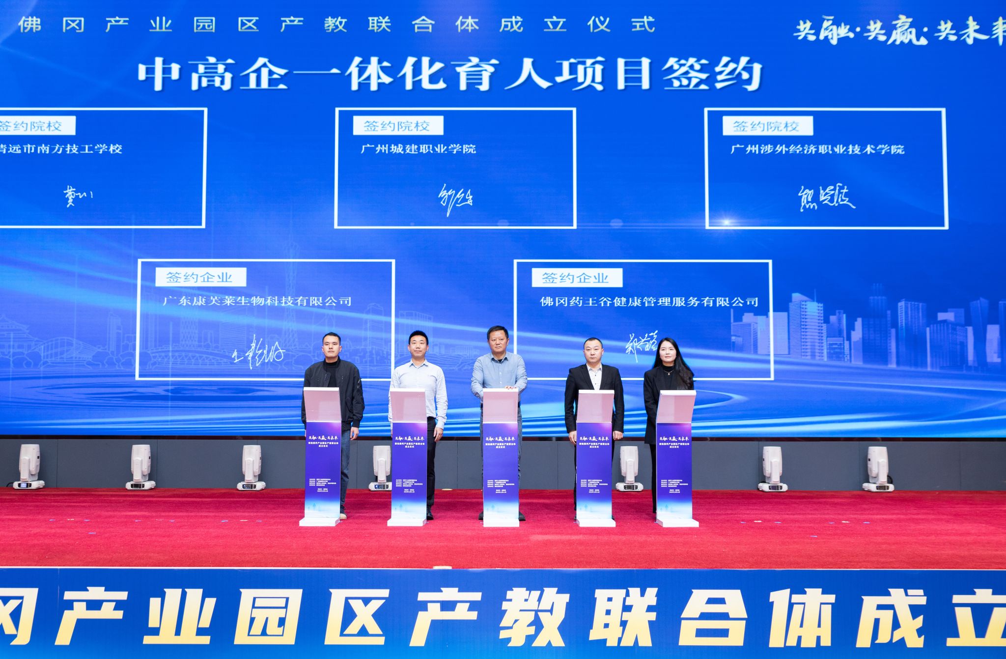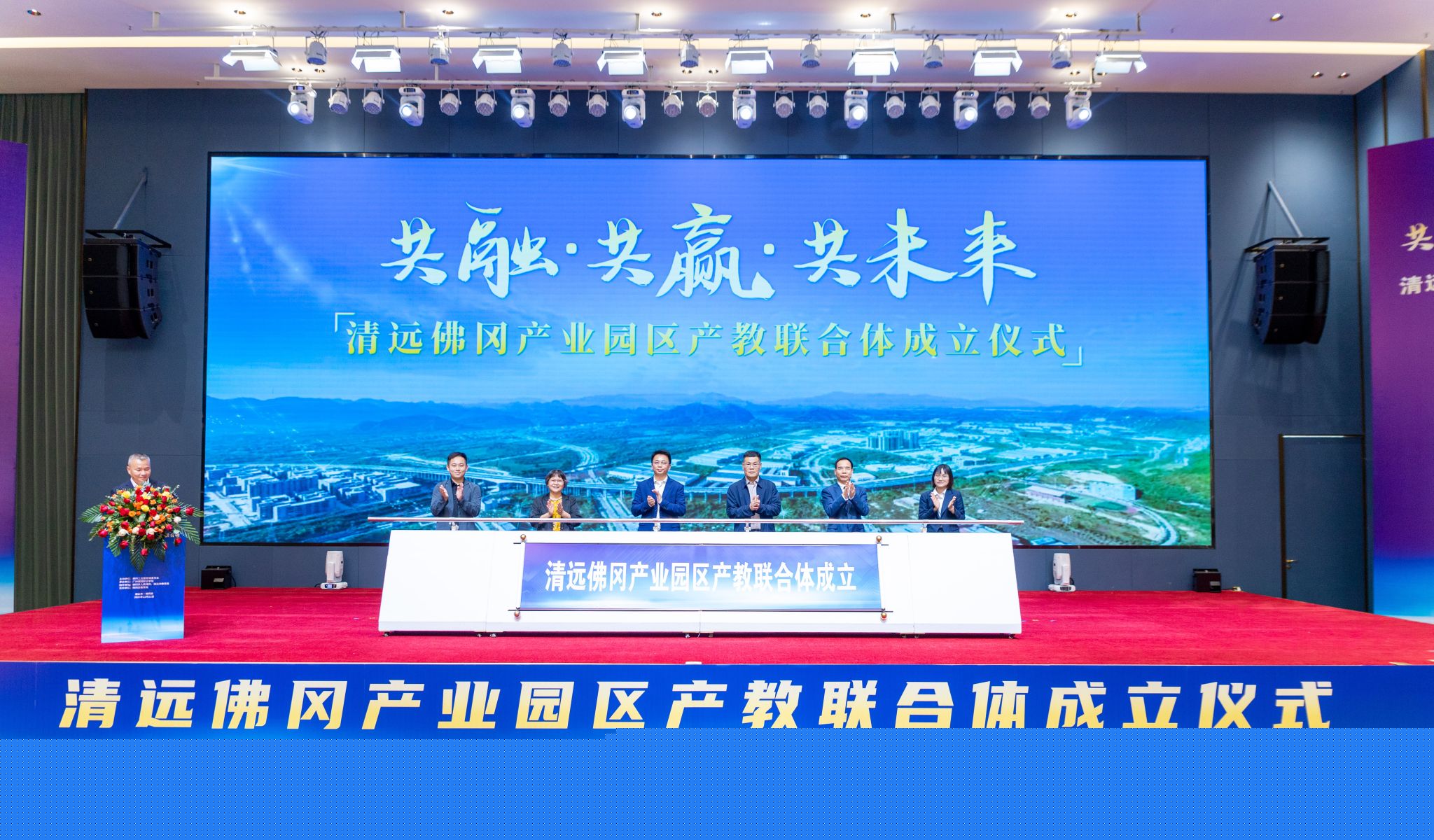 大會核心環(huán)節(jié)中,佛岡縣政府代表陳技常務(wù)副縣長、清遠(yuǎn)市教育行政部門代表葉燦強(qiáng)主任督學(xué)、佛岡縣工業(yè)園管委會代表曾潔麗同志、學(xué)校代表李國年校長、企業(yè)代表侯偉越主管與郭惠平副主管共同上臺推動啟動桿,正式宣告清遠(yuǎn)佛岡產(chǎn)業(yè)園區(qū)產(chǎn)教聯(lián)合體成立。這一里程碑時刻,標(biāo)志著佛岡產(chǎn)教融合進(jìn)入資源整合、協(xié)同發(fā)力的新階段,開啟了人才共育、產(chǎn)業(yè)共興、區(qū)域共榮的新征程。