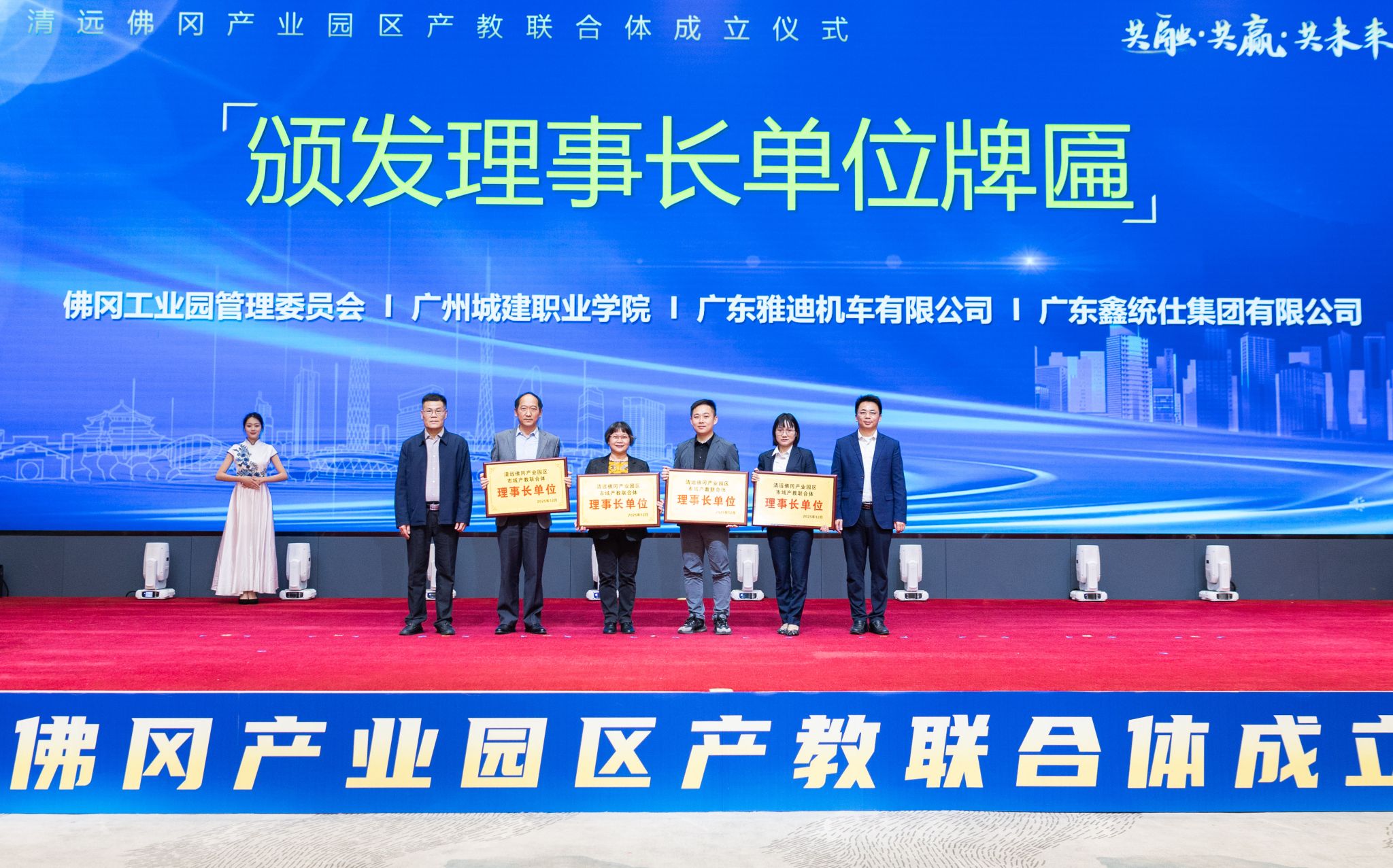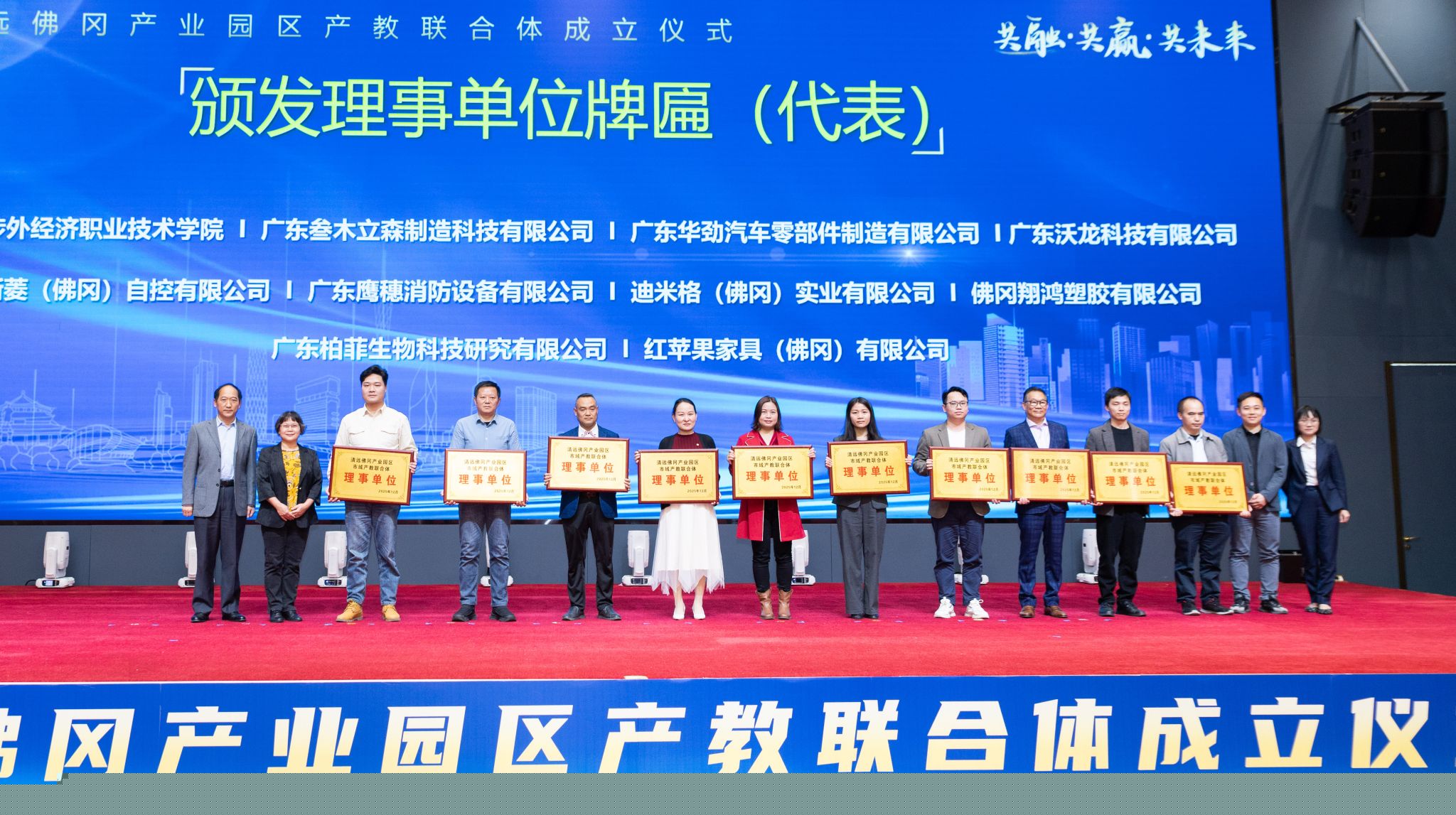 啟動儀式后,大會舉行了理事長單位與理事單位授牌儀式。佛岡縣工業(yè)園管委會、廣州城建職業(yè)學(xué)院、廣東雅迪機(jī)車有限公司、廣東鑫統(tǒng)仕集團(tuán)有限公司作為牽頭單位,獲授理事長單位牌匾;廣州涉外經(jīng)濟(jì)職業(yè)技術(shù)學(xué)院、廣東叁木立森制造科技有限公司等10余家高校與企業(yè)成為首批理事單位。授牌儀式不僅是對各單位在產(chǎn)教融合事業(yè)中重要作用的認(rèn)可,更凝聚了各方攜手共進(jìn)、深化合作的堅定共識。