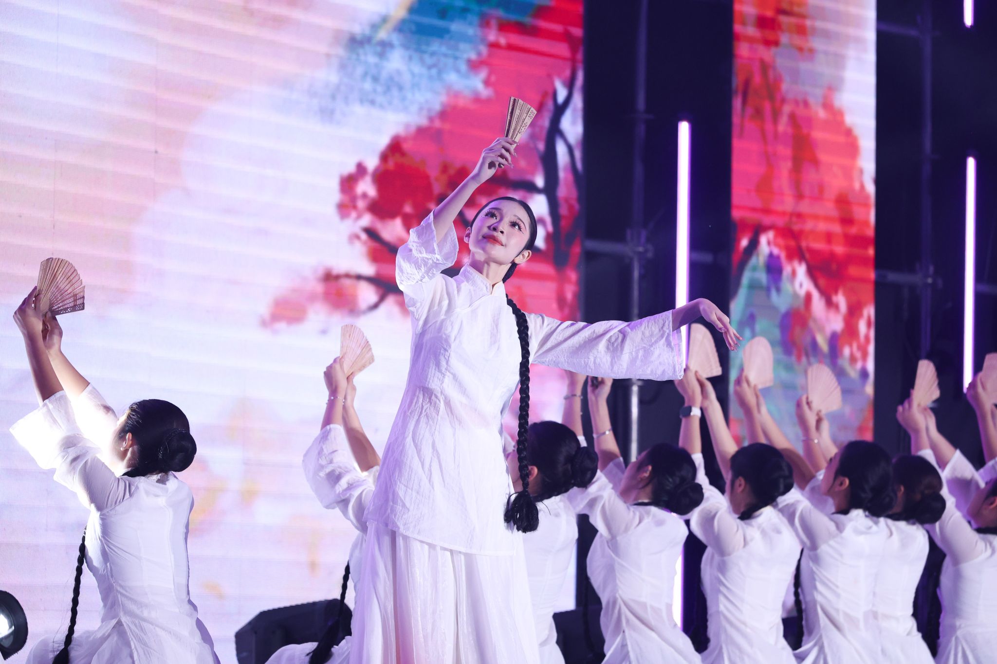 從激情澎湃的朗誦《青春正當(dāng)燃》,到深情演繹的《身騎白馬》;從動(dòng)感十足的街舞《Cyborg Dance》,到校園十大歌手聯(lián)袂獻(xiàn)唱的《與你共赴明天》,第一篇章以多元形式詮釋了青春的活力與夢(mèng)想的厚度。第二篇章中,小品《此刻》以幽默溫情聚焦校園生活;古典舞《香扇藏春》盡展東方韻味;民樂(lè)合奏《雙面燕洵》琴瑟和鳴、舞影翩躚;歌曲《天空沒(méi)有極限》唱出了學(xué)子勇往直前的心聲。第三篇章在充滿力量的《心手相連》中開(kāi)啟,情景大合唱《山河回響,沂蒙情》深情動(dòng)人,走秀《元啟新程,馬踏霓裳》華美大氣;最后,晚會(huì)在歌舞《心聲》中圓滿落下帷幕。