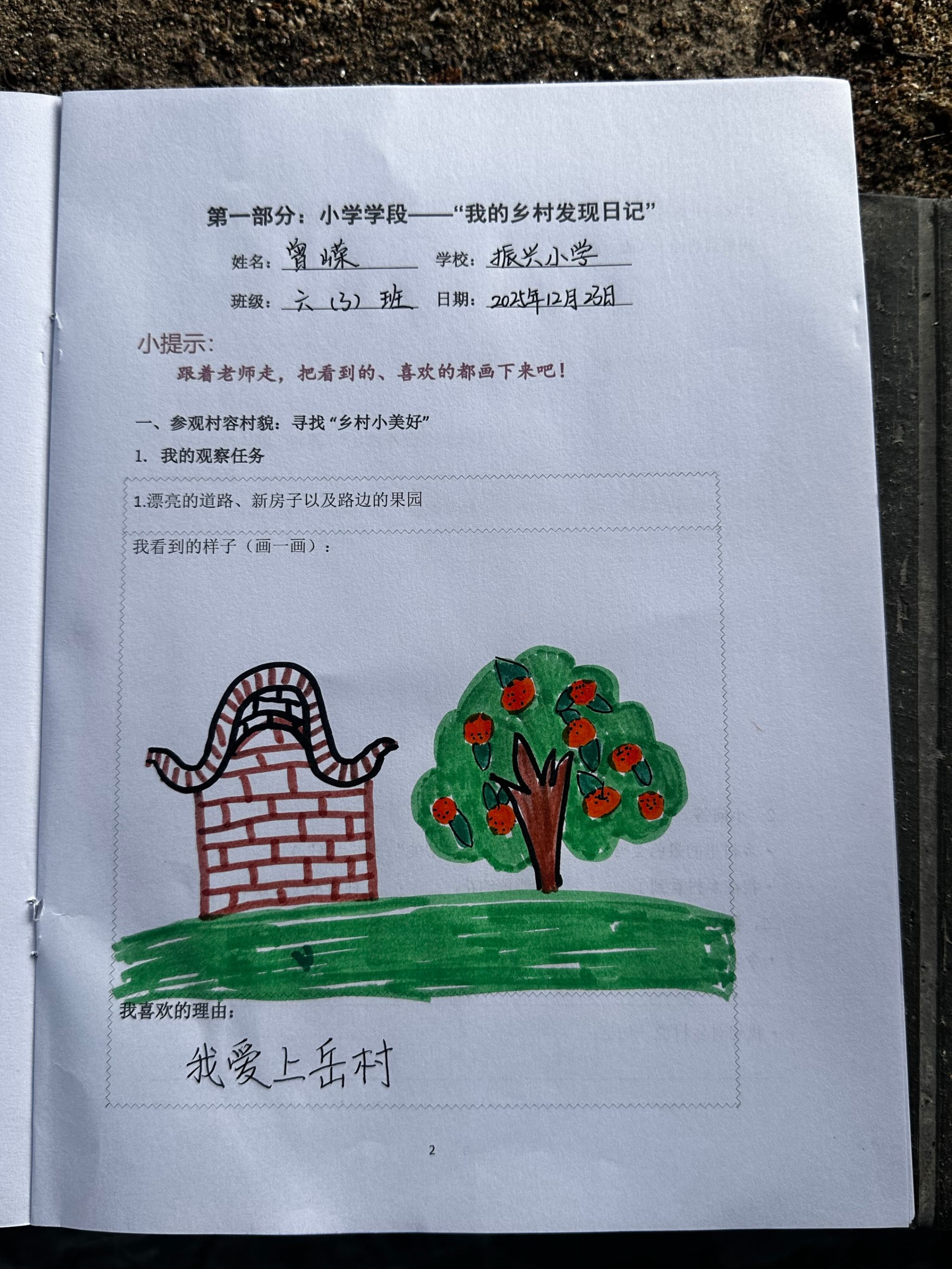 學(xué)校對教學(xué)手冊進行分層設(shè)計,不同學(xué)段的學(xué)生將當(dāng)天的學(xué)習(xí)收獲轉(zhuǎn)化為不同表達的成長印記。小學(xué)生用稚嫩的畫筆勾勒出他們在鄉(xiāng)村的“尋美足跡”;中學(xué)生以觀察者的視角描述鄉(xiāng)村基礎(chǔ)設(shè)施、村容村貌的變遷與村民幸福指數(shù)的提升;大學(xué)生則以理論為鏡,以數(shù)據(jù)為據(jù),系統(tǒng)剖析上岳村在鄉(xiāng)村振興戰(zhàn)略指引下的結(jié)構(gòu)性變革,對鄉(xiāng)村振興、責(zé)任擔(dān)當(dāng)有更真切的理解。大中小學(xué)生在同一片土地上,用不同深度的書寫,共同完成了對“鄉(xiāng)村振興”這場偉大實踐的多維解讀,生動展現(xiàn)了大中小思政課一體化“循序漸進,螺旋上升”的育人規(guī)律。