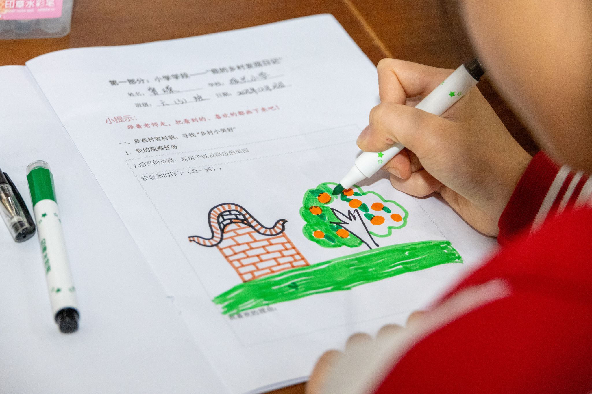 “我從小出生在這里,爸爸媽媽也在這邊工作?!彼^中心小學(xué)的肖同學(xué)在筆記中畫下了一條條馬路,她說,現(xiàn)在的道路全是新修的,特別好走,我的家鄉(xiāng)也在越來越好。