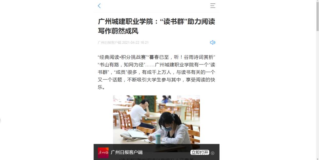 “經(jīng)典閱讀?積分挑戰(zhàn)賽”“暮春已至,聽!谷雨詩詞賞析”“書山有路,知網(wǎng)為徑”……廣州城建職業(yè)學(xué)院有一個“讀書群”,“成員”很多,有成千上萬人,與讀書有關(guān)的一個又一個話題,不斷吸引大學(xué)生參與其中,享受閱讀的快樂。