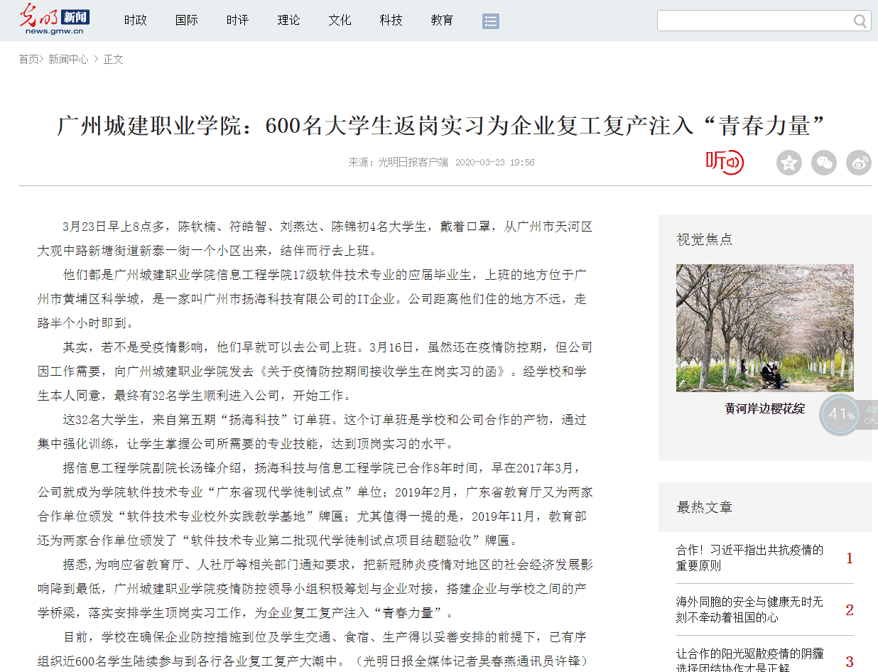 《光明網(wǎng)》:廣州城建職業(yè)學(xué)院:600名大學(xué)生返崗實(shí)習(xí)為企業(yè)復(fù)工復(fù)產(chǎn)注入“青春力量”