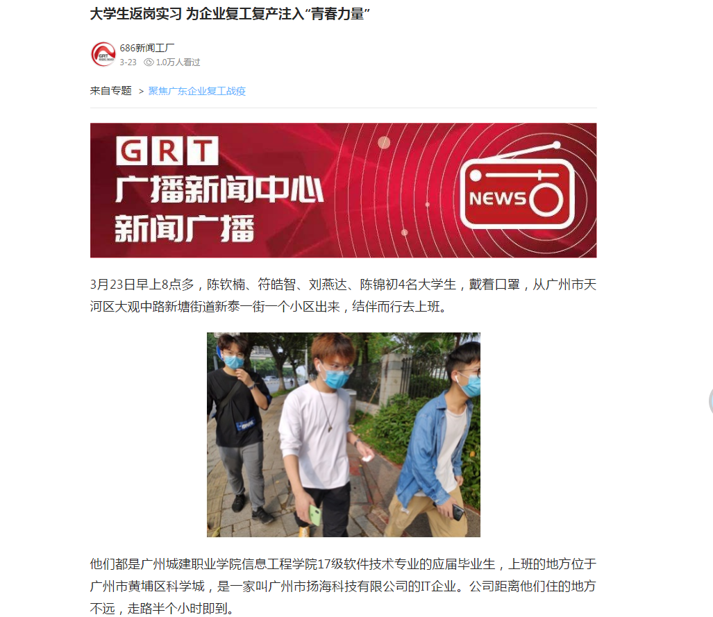 《廣東新聞廣播》:大學(xué)生返崗實(shí)習(xí) 為企業(yè)復(fù)工復(fù)產(chǎn)注入“青春力量”