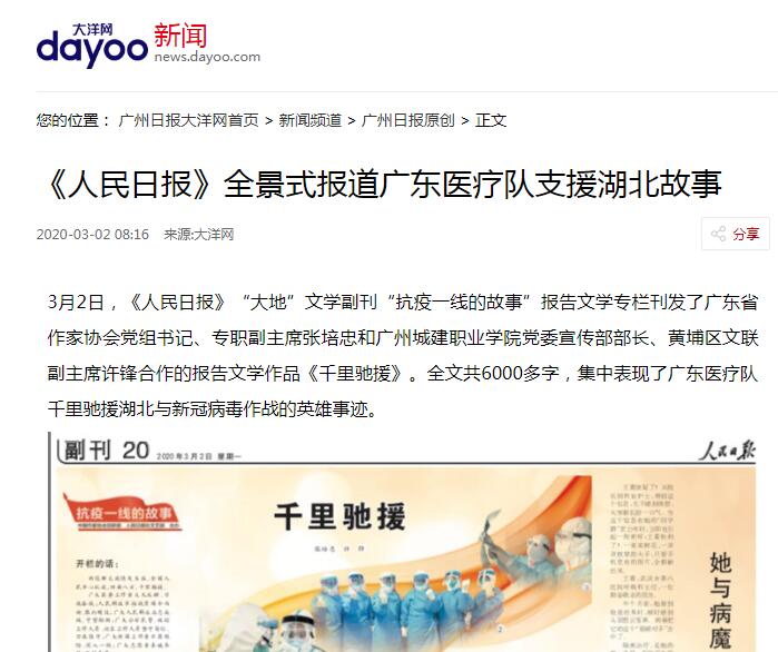 大洋網(wǎng):《人民日?qǐng)?bào)》全景式報(bào)道廣東醫(yī)療隊(duì)支援湖北故事