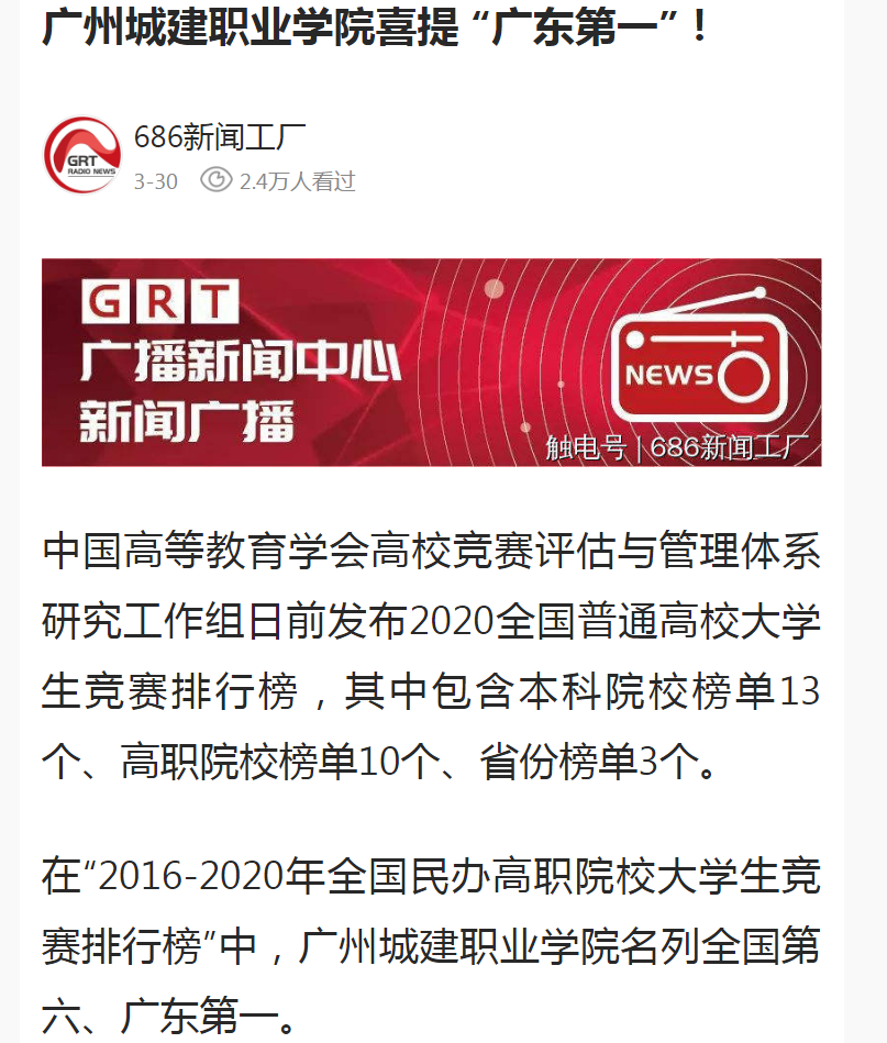 【廣東廣播電臺(tái)686新聞工廠(chǎng)】廣州城建職業(yè)學(xué)院喜提“廣東第一”