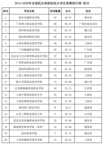 在“2016-2020年全國(guó)民辦高職院校大學(xué)生競(jìng)賽排行榜”中,廣州城建職業(yè)學(xué)院名列全國(guó)第六、廣東第一。