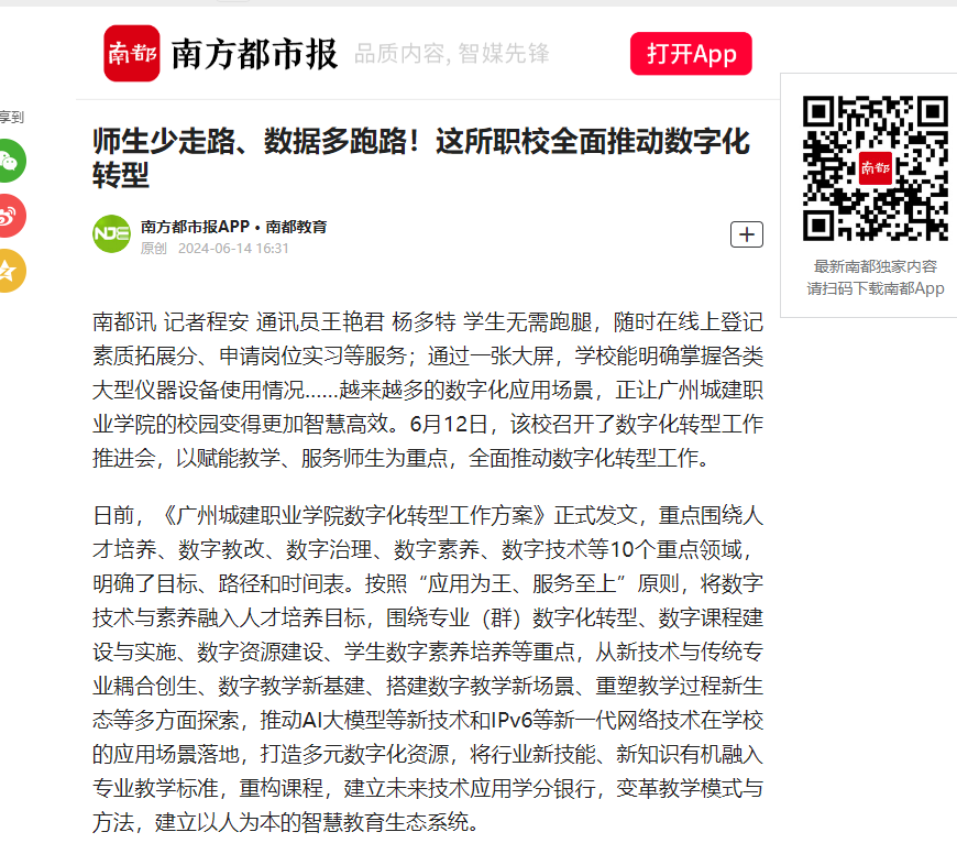學(xué)生無需跑腿,隨時在線上登記素質(zhì)拓展分、申請崗位實習(xí)等服務(wù);通過一張大屏,學(xué)校能明確掌握各類大型儀器設(shè)備使用情況……越來越多的數(shù)字化應(yīng)用場景,正讓廣州城建職業(yè)學(xué)院的校園變得更加智慧高效。6月12日,該校召開了數(shù)字化轉(zhuǎn)型工作推進(jìn)會,以賦能教學(xué)、服務(wù)師生為重點,全面推動數(shù)字化轉(zhuǎn)型工作。