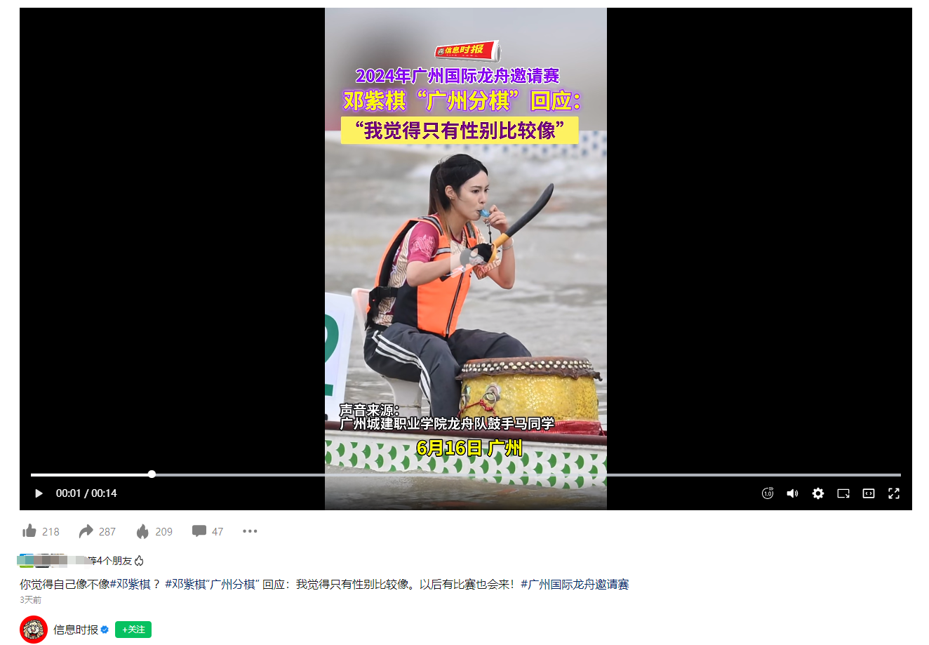 你覺得自己像不像#鄧紫棋?#鄧紫棋“廣州分棋”回應:我覺得只有性別比較像。以后有比賽也會來!#廣州國際龍舟邀請賽