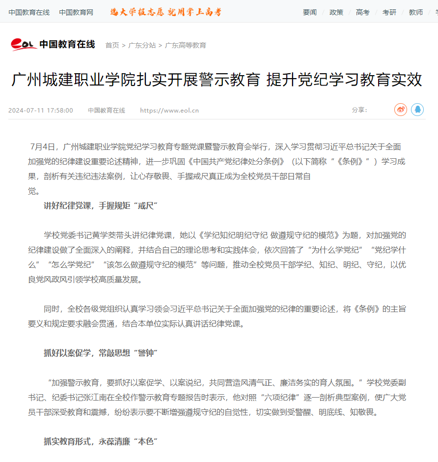 7月4日,廣州城建職業(yè)學(xué)院黨紀(jì)學(xué)習(xí)教育專題黨課暨警示教育會(huì)舉行,深入學(xué)習(xí)貫徹習(xí)近平總書(shū)記關(guān)于全面加強(qiáng)黨的紀(jì)律建設(shè)重要論述精神,進(jìn)一步鞏固《中國(guó)共產(chǎn)黨紀(jì)律處分條例》(以下簡(jiǎn)稱“《條例》”)學(xué)習(xí)成果,剖析有關(guān)違紀(jì)違法案例,讓心存敬畏、手握戒尺真正成為全校黨員干部日常自覺(jué)。