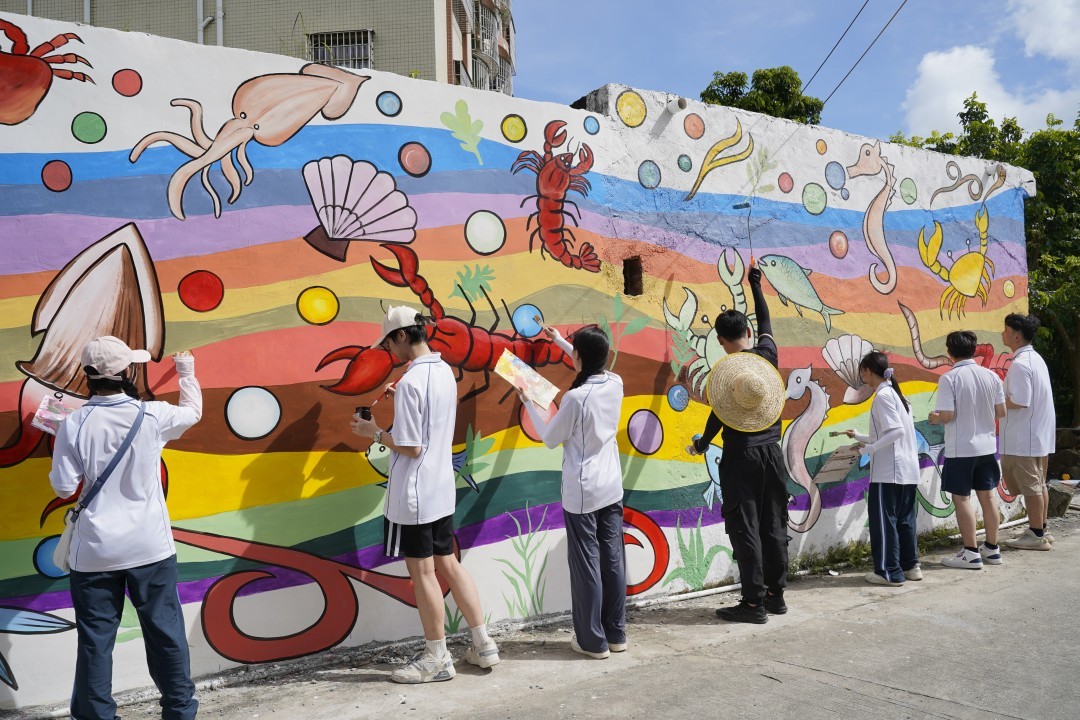 據(jù)悉,這已是該校連續(xù)3年來到該地開展鄉(xiāng)村墻繪活動。馬屋村周邊群山環(huán)繞、植被豐富、風景秀麗,老師帶著學生們手持畫筆和顏料,頂著大太陽、一筆一畫地先在墻壁上勾勒線條,打好草稿,再用調(diào)好的顏料進行涂繪。經(jīng)過精心創(chuàng)作,海蝦、魷魚、海螺等栩栩如生的海洋生物躍然“墻”上?;顒悠陂g,該校校長蔣新華、藝術(shù)與設(shè)計學院院長劉境奇等加入到墻繪創(chuàng)作中,與突擊隊師生一起為鄉(xiāng)村添彩增色。“一直以來,學校始終聚焦職業(yè)教育服務(wù)‘百千萬工程’建設(shè)需要,積極引導青年學子結(jié)合國家需要和所學專業(yè),以創(chuàng)新、靈活的方式在助力鄉(xiāng)村振興的實踐中成長成才?!笔Y新華表示。