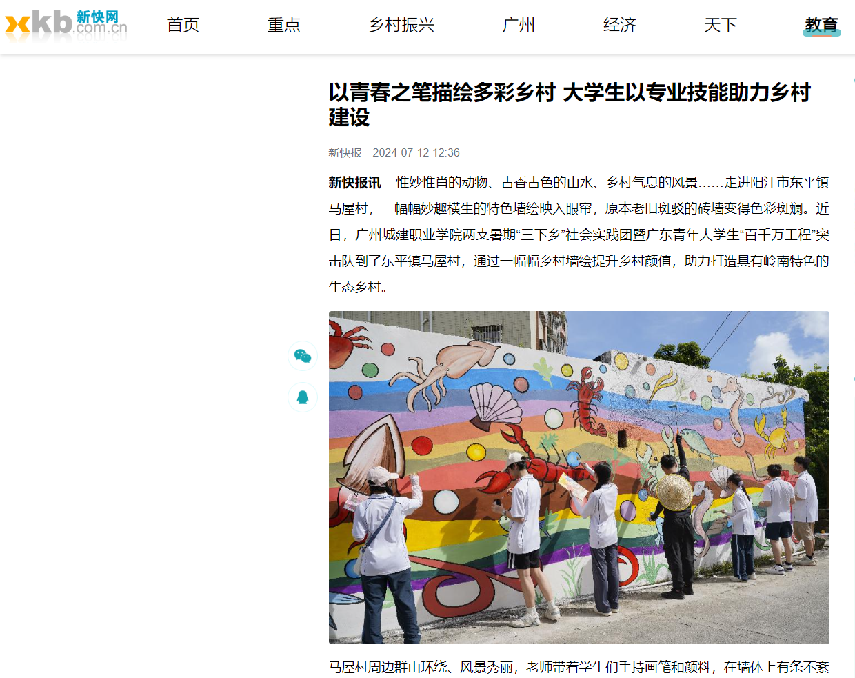 惟妙惟肖的動物、古香古色的山水、鄉(xiāng)村氣息的風(fēng)景……走進陽江市東平鎮(zhèn)馬屋村,一幅幅妙趣橫生的特色墻繪映入眼簾,原本老舊斑駁的磚墻變得色彩斑斕。近日,廣州城建職業(yè)學(xué)院兩支暑期“三下鄉(xiāng)”社會實踐團暨廣東青年大學(xué)生“百千萬工程”突擊隊到了東平鎮(zhèn)馬屋村,通過一幅幅鄉(xiāng)村墻繪提升鄉(xiāng)村顏值,助力打造具有嶺南特色的生態(tài)鄉(xiāng)村。