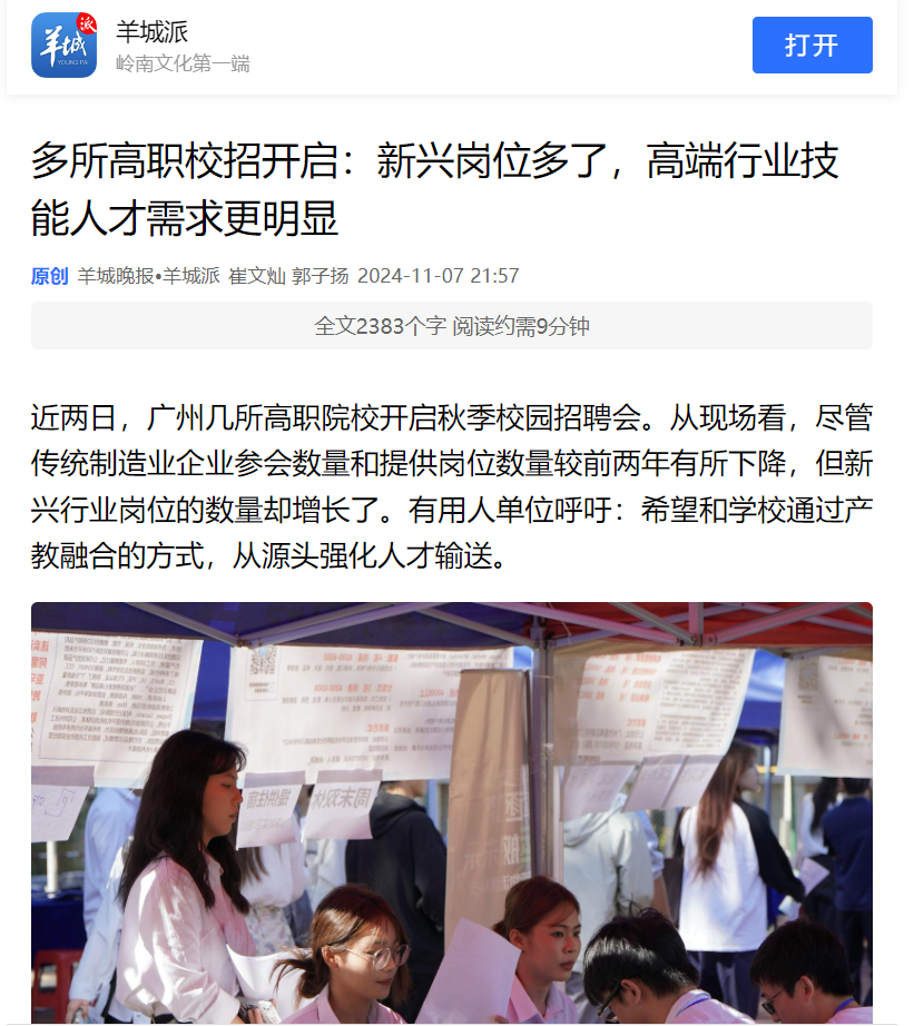 近兩日,廣州幾所高職院校開啟秋季校園招聘會(huì)。從現(xiàn)場(chǎng)看,盡管傳統(tǒng)制造業(yè)企業(yè)參會(huì)數(shù)量和提供崗位數(shù)量較前兩年有所下降,但新興行業(yè)崗位的數(shù)量卻增長(zhǎng)了。有用人單位呼吁:希望和學(xué)校通過(guò)產(chǎn)教融合的方式,從源頭強(qiáng)化人才輸送。