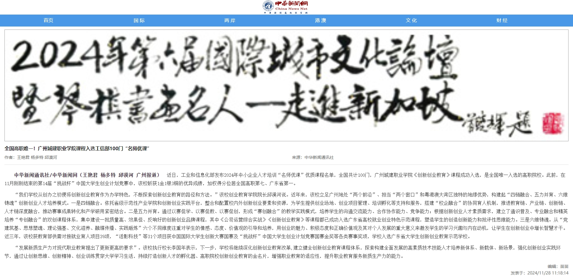 近日,工業(yè)和信息化部發(fā)布2024年中小企業(yè)人才培訓(xùn)“名師優(yōu)課”優(yōu)質(zhì)課程名單,全國共計100門,廣州城建職業(yè)學(xué)院《創(chuàng)新創(chuàng)業(yè)教育》課程成功入選,是全國唯一入選的高職院校。此前,在11月剛剛結(jié)束的第14屆“挑戰(zhàn)杯”中國大學(xué)生創(chuàng)業(yè)計劃競賽中,該校斬獲1金1銀3銅的優(yōu)異成績,加權(quán)得分位居全國高職第七、廣東省第一。
