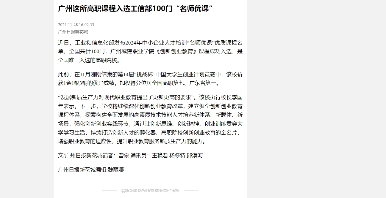近日,工業(yè)和信息化部發(fā)布2024年中小企業(yè)人才培訓“名師優(yōu)課”優(yōu)質課程名單,全國共計100門,廣州城建職業(yè)學院《創(chuàng)新創(chuàng)業(yè)教育》課程成功入選,是全國唯一入選的高職院校。