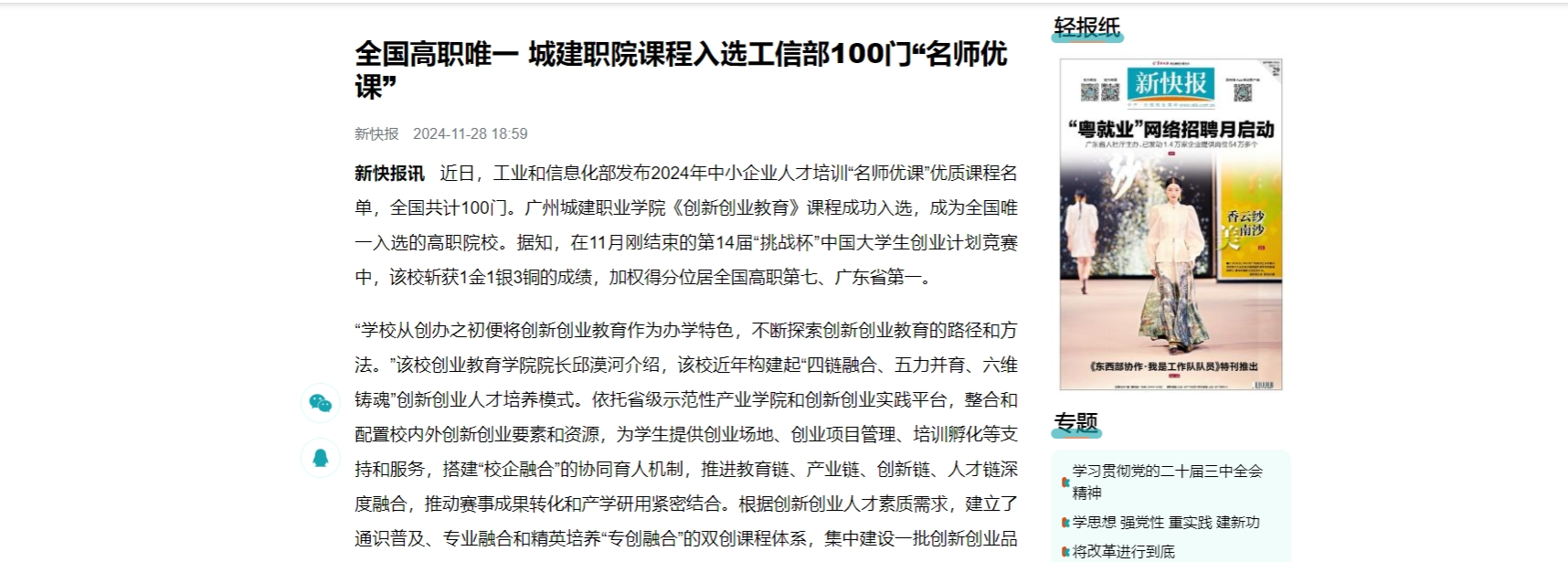 近日,工業(yè)和信息化部發(fā)布2024年中小企業(yè)人才培訓(xùn)“名師優(yōu)課”優(yōu)質(zhì)課程名單,全國共計100門。廣州城建職業(yè)學院《創(chuàng)新創(chuàng)業(yè)教育》課程成功入選,成為全國唯一入選的高職院校。據(jù)知,在11月剛結(jié)束的第14屆“挑戰(zhàn)杯”中國大學生創(chuàng)業(yè)計劃競賽中,該校斬獲1金1銀3銅的成績,加權(quán)得分位居全國高職第七、廣東省第一。
