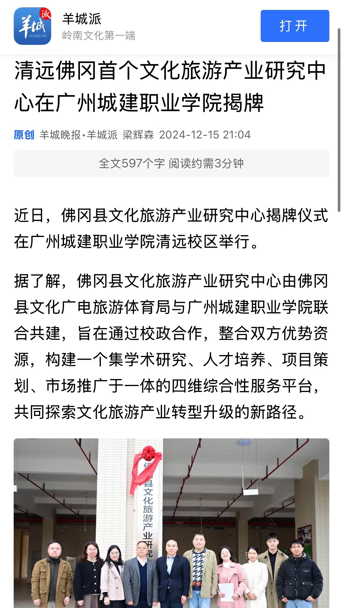 近日,佛岡縣文化旅游產(chǎn)業(yè)研究中心揭牌儀式在廣州城建職業(yè)學(xué)院清遠校區(qū)舉行。