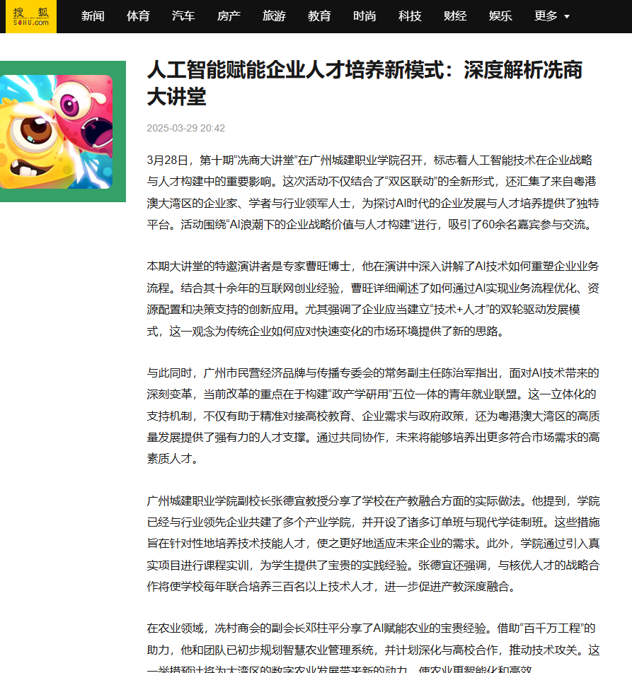 3月28日,第十期“冼商大講堂”在廣州城建職業(yè)學(xué)院召開,標(biāo)志著人工智能技術(shù)在企業(yè)戰(zhàn)略與人才構(gòu)建中的重要影響。這次活動不僅結(jié)合了“雙區(qū)聯(lián)動”的全新形式,還匯集了來自粵港澳大灣區(qū)的企業(yè)家、學(xué)者與行業(yè)領(lǐng)軍人士,為探討AI時代的企業(yè)發(fā)展與人才培養(yǎng)提供了獨特平臺?;顒訃@“AI浪潮下的企業(yè)戰(zhàn)略價值與人才構(gòu)建”進(jìn)行,吸引了60余名嘉賓參與交流。