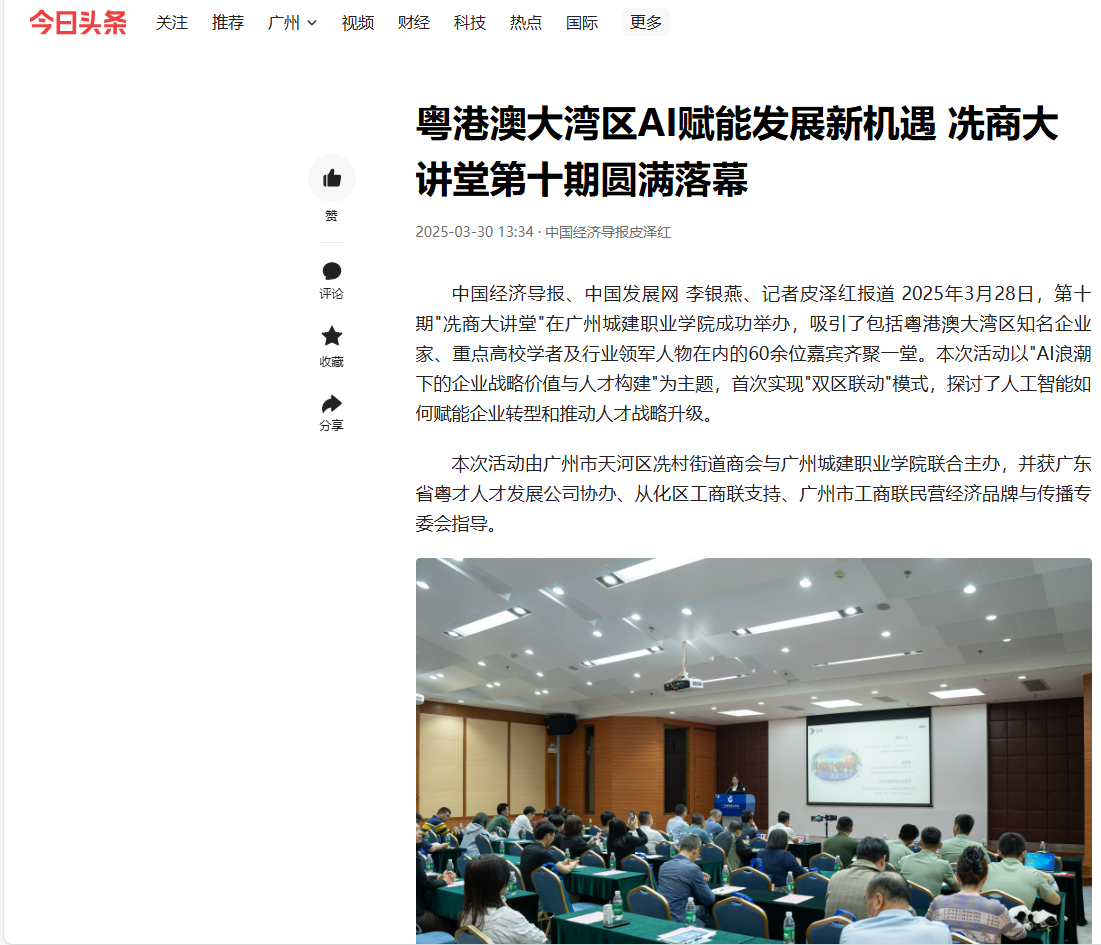 中國(guó)經(jīng)濟(jì)導(dǎo)報(bào)、中國(guó)發(fā)展網(wǎng) 李銀燕、記者皮澤紅報(bào)道 2025年3月28日,第十期"冼商大講堂"在廣州城建職業(yè)學(xué)院成功舉辦,吸引了包括粵港澳大灣區(qū)知名企業(yè)家、重點(diǎn)高校學(xué)者及行業(yè)領(lǐng)軍人物在內(nèi)的60余位嘉賓齊聚一堂。本次活動(dòng)以"AI浪潮下的企業(yè)戰(zhàn)略價(jià)值與人才構(gòu)建"為主題,首次實(shí)現(xiàn)"雙區(qū)聯(lián)動(dòng)"模式,探討了人工智能如何賦能企業(yè)轉(zhuǎn)型和推動(dòng)人才戰(zhàn)略升級(jí)。