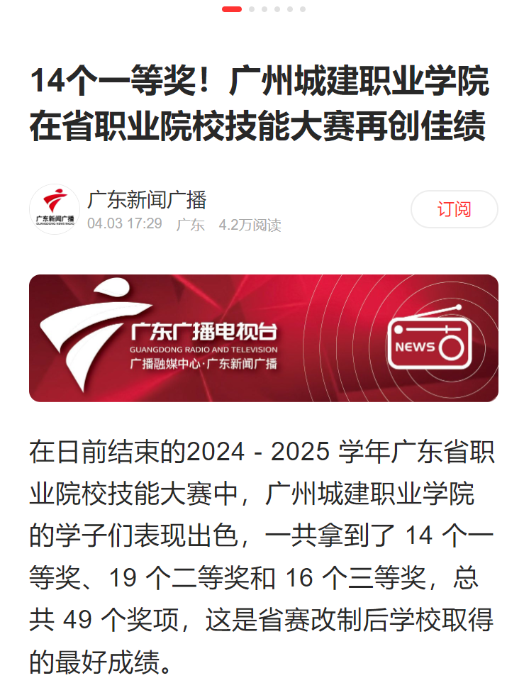 在日前結(jié)束的2024 - 2025 學年廣東省職業(yè)院校技能大賽中,廣州城建職業(yè)學院的學子們表現(xiàn)出色,一共拿到了 14 個一等獎、19 個二等獎和 16 個三等獎,總共 49 個獎項,這是省賽改制后學校取得的最好成績。