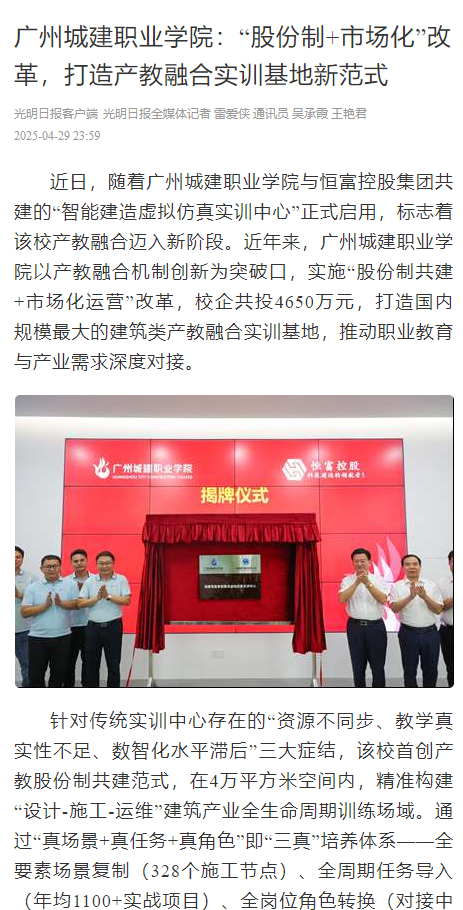 近日,隨著廣州城建職業(yè)學(xué)院與恒富控股集團(tuán)共建的“智能建造虛擬仿真實訓(xùn)中心”正式啟用,標(biāo)志著該校產(chǎn)教融合邁入新階段。近年來,廣州城建職業(yè)學(xué)院以產(chǎn)教融合機制創(chuàng)新為突破口,實施“股份制共建+市場化運營”改革,校企共投4650萬元,打造國內(nèi)規(guī)模最大的建筑類產(chǎn)教融合實訓(xùn)基地,推動職業(yè)教育與產(chǎn)業(yè)需求深度對接。