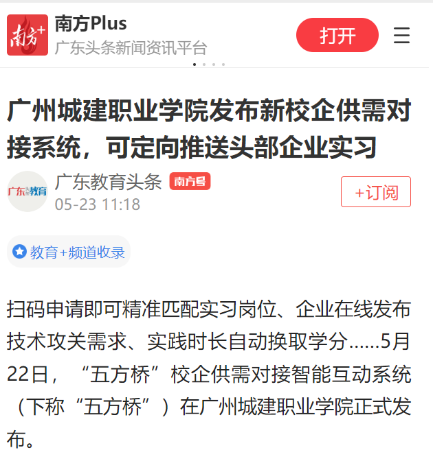 掃碼申請(qǐng)即可精準(zhǔn)匹配實(shí)習(xí)崗位、企業(yè)在線發(fā)布技術(shù)攻關(guān)需求、實(shí)踐時(shí)長(zhǎng)自動(dòng)換取學(xué)分……5月22日,“五方橋”校企供需對(duì)接智能互動(dòng)系統(tǒng)(下稱“五方橋”)在廣州城建職業(yè)學(xué)院正式發(fā)布。