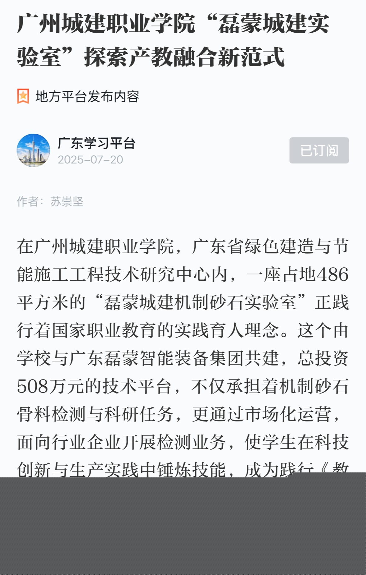 在廣州城建職業(yè)學(xué)院,廣東省綠色建造與節(jié)能施工工程技術(shù)研究中心內(nèi),一座占地486平方米的“磊蒙城建機(jī)制砂石實(shí)驗(yàn)室”正踐行著國家職業(yè)教育的實(shí)踐育人理念。這個(gè)由學(xué)校與廣東磊蒙智能裝備集團(tuán)共建,總投資508萬元的技術(shù)平臺(tái),不僅承擔(dān)著機(jī)制砂石骨料檢測與科研任務(wù),更通過市場化運(yùn)營,面向行業(yè)企業(yè)開展檢測業(yè)務(wù),使學(xué)生在科技創(chuàng)新與生產(chǎn)實(shí)踐中錘煉技能,成為踐行《教育強(qiáng)國建設(shè)規(guī)劃綱要(2024—2035年)》“推動(dòng)教育鏈、人才鏈與產(chǎn)業(yè)鏈深度對(duì)接”的生動(dòng)樣板。