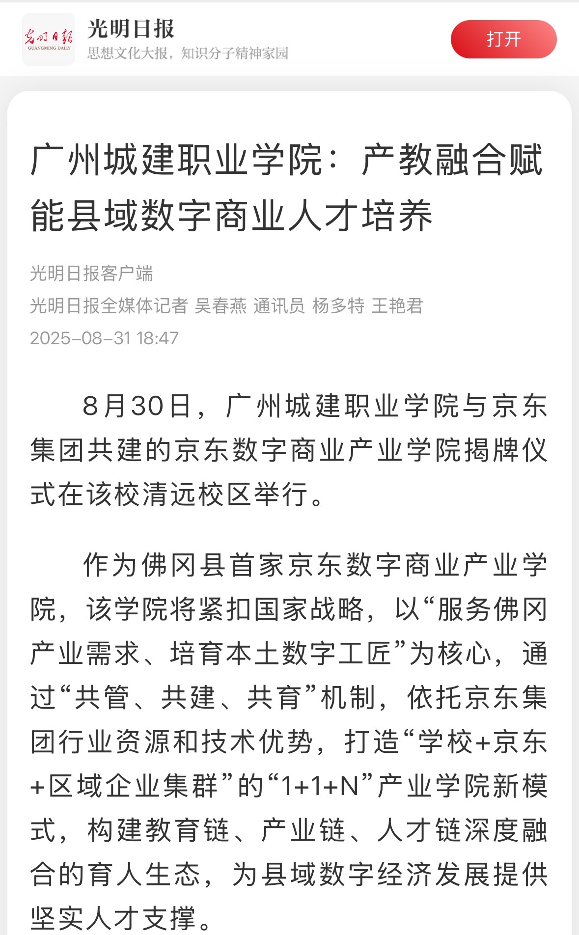 8月30日,廣州城建職業(yè)學(xué)院與京東集團(tuán)共建的京東數(shù)字商業(yè)產(chǎn)業(yè)學(xué)院揭牌儀式在該校清遠(yuǎn)校區(qū)舉行。