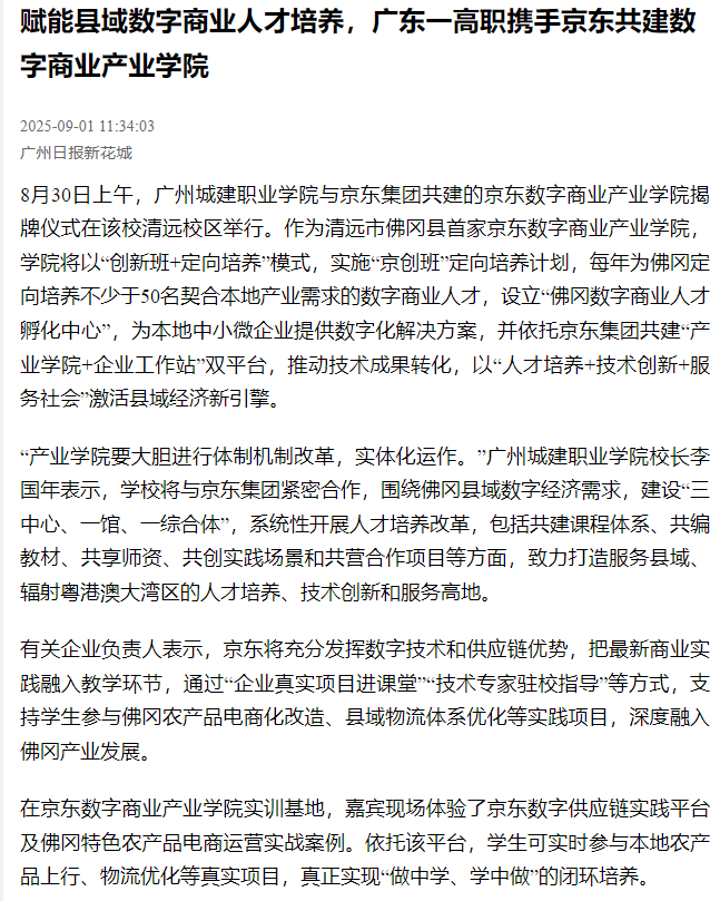 8月30日上午,廣州城建職業(yè)學(xué)院與京東集團(tuán)共建的京東數(shù)字商業(yè)產(chǎn)業(yè)學(xué)院揭牌儀式在該校清遠(yuǎn)校區(qū)舉行。作為清遠(yuǎn)市佛岡縣首家京東數(shù)字商業(yè)產(chǎn)業(yè)學(xué)院,學(xué)院將以“創(chuàng)新班+定向培養(yǎng)”模式,實(shí)施“京創(chuàng)班”定向培養(yǎng)計(jì)劃,每年為佛岡定向培養(yǎng)不少于50名契合本地產(chǎn)業(yè)需求的數(shù)字商業(yè)人才,設(shè)立“佛岡數(shù)字商業(yè)人才孵化中心”,為本地中小微企業(yè)提供數(shù)字化解決方案,并依托京東集團(tuán)共建“產(chǎn)業(yè)學(xué)院+企業(yè)工作站”雙平臺(tái),推動(dòng)技術(shù)成果轉(zhuǎn)化,以“人才培養(yǎng)+技術(shù)創(chuàng)新+服務(wù)社會(huì)”激活縣域經(jīng)濟(jì)新引擎。