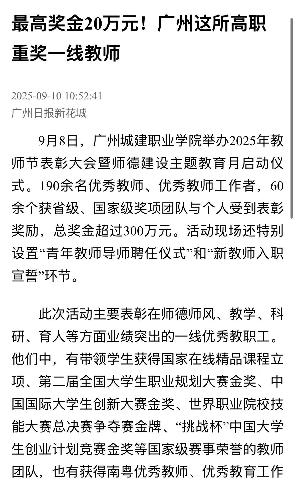 9月8日,廣州城建職業(yè)學(xué)院舉辦2025年教師節(jié)表彰大會暨師德建設(shè)主題教育月啟動儀式。190余名優(yōu)秀教師、優(yōu)秀教師工作者,60余個獲省級、國家級獎項團隊與個人受到表彰獎勵,總獎金超過300萬元?;顒蝇F(xiàn)場還特別設(shè)置“青年教師導(dǎo)師聘任儀式”和“新教師入職宣誓”環(huán)節(jié)。
