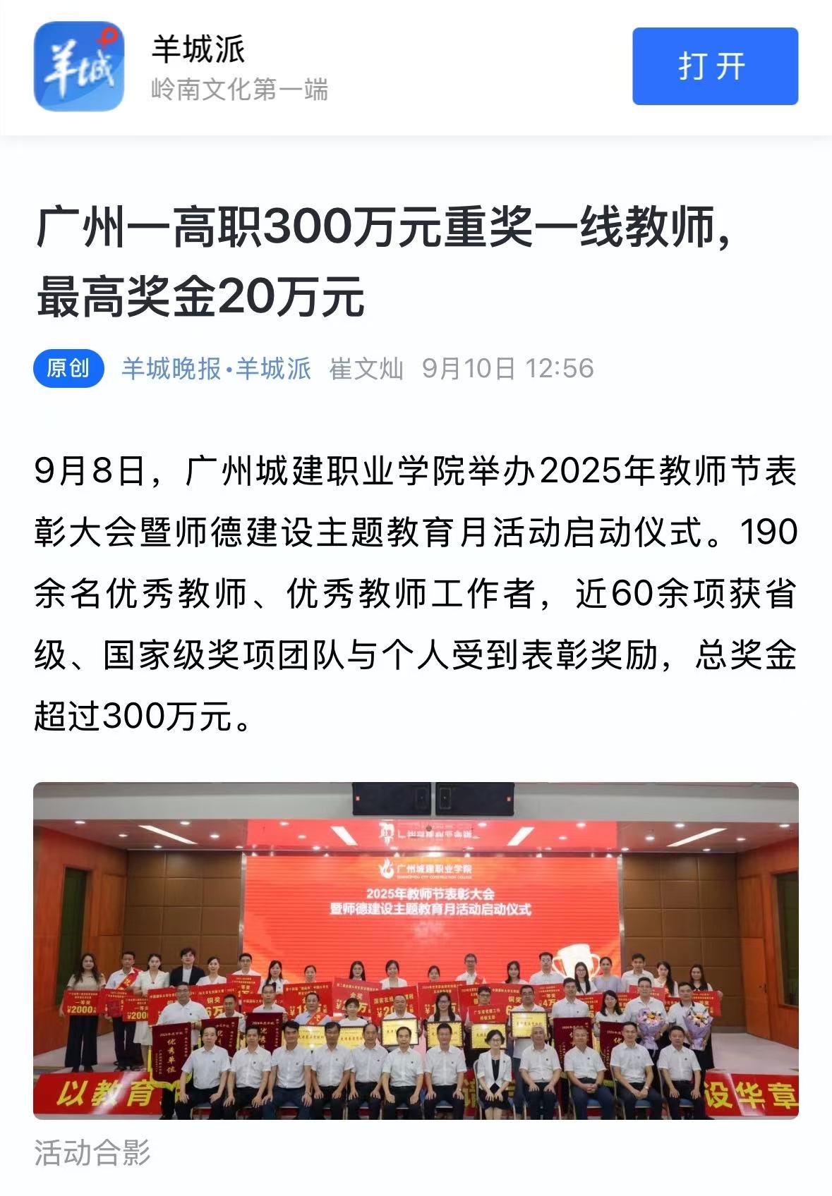 9月8日,廣州城建職業(yè)學(xué)院舉辦2025年教師節(jié)表彰大會暨師德建設(shè)主題教育月活動啟動儀式。190余名優(yōu)秀教師、優(yōu)秀教師工作者,近60余項(xiàng)獲省級、國家級獎項(xiàng)團(tuán)隊(duì)與個人受到表彰獎勵,總獎金超過300萬元。