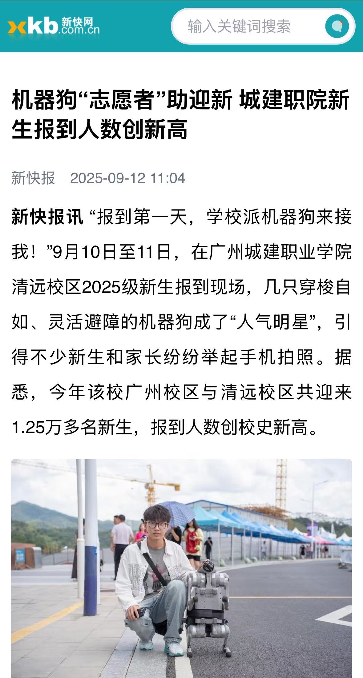 “報到第一天,學校派機器狗來接我!”9月10日至11日,在廣州城建職業(yè)學院清遠校區(qū)2025級新生報到現(xiàn)場,幾只穿梭自如、靈活避障的機器狗成了“人氣明星”,引得不少新生和家長紛紛舉起手機拍照。據(jù)悉,今年該校廣州校區(qū)與清遠校區(qū)共迎來1.25萬多名新生,報到人數(shù)創(chuàng)校史新高。