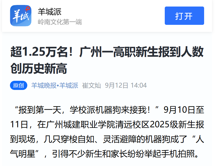 “報到第一天,學校派機器狗來接我!”9月10日至11日,在廣州城建職業(yè)學院清遠校區(qū)2025級新生報到現(xiàn)場,幾只穿梭自如、靈活避障的機器狗成了“人氣明星”,引得不少新生和家長紛紛舉起手機拍照。