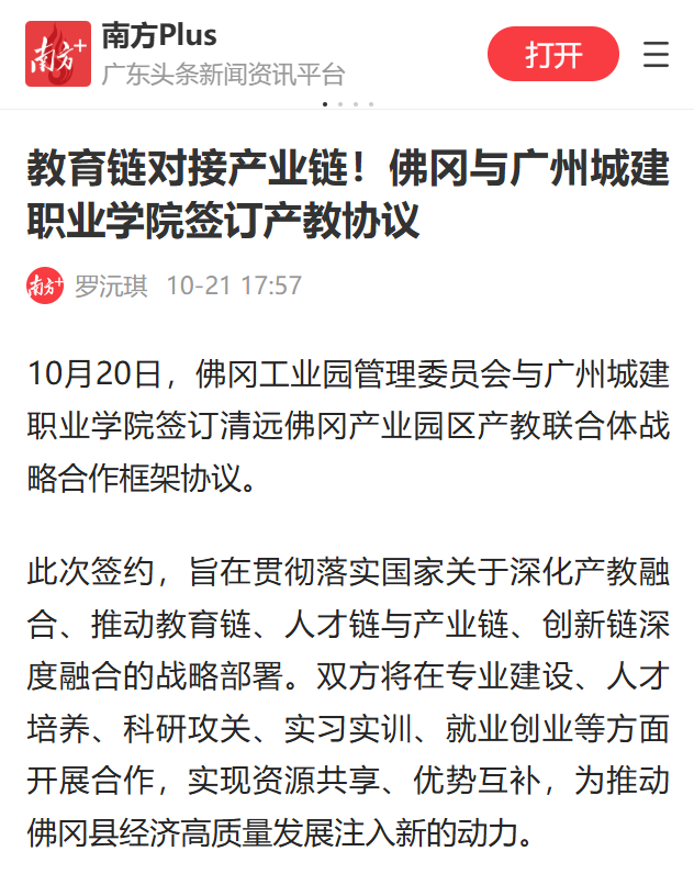 10月20日,佛岡工業(yè)園管理委員會(huì)與廣州城建職業(yè)學(xué)院簽訂清遠(yuǎn)佛岡產(chǎn)業(yè)園區(qū)產(chǎn)教聯(lián)合體戰(zhàn)略合作框架協(xié)議。