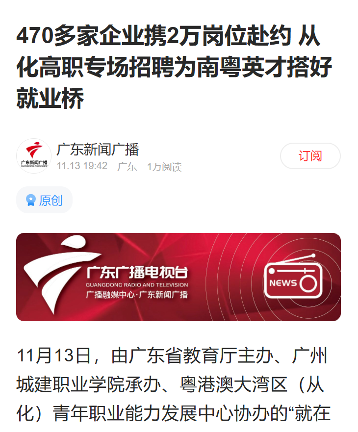 11月13日,由廣東省教育廳主辦、廣州城建職業(yè)學(xué)院承辦、粵港澳大灣區(qū)(從化)青年職業(yè)能力發(fā)展中心協(xié)辦的“就在南粵”廣東省2026屆普通高校畢業(yè)生系列供需見(jiàn)面活動(dòng)--從化地區(qū)高職高專專場(chǎng),在廣州城建職業(yè)學(xué)院成功舉辦。