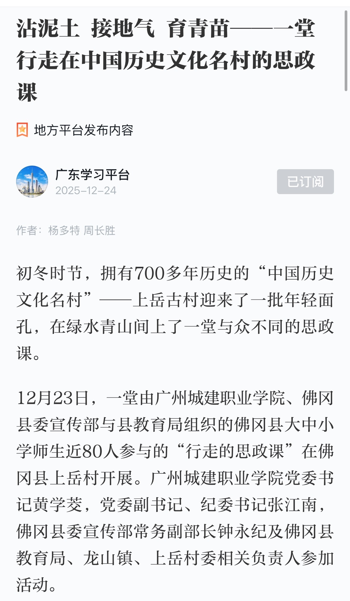 12月23日,一堂由廣州城建職業(yè)學(xué)院、佛岡縣委宣傳部與縣教育局組織的佛岡縣大中小學(xué)師生近80人參與的“行走的思政課”在佛岡縣上岳村開展。廣州城建職業(yè)學(xué)院黨委書記黃學(xué)茭,黨委副書記、紀(jì)委書記張江南,佛岡縣委宣傳部常務(wù)副部長(zhǎng)鐘永紀(jì)及佛岡縣教育局、龍山鎮(zhèn)、上岳村委相關(guān)負(fù)責(zé)人參加活動(dòng)。