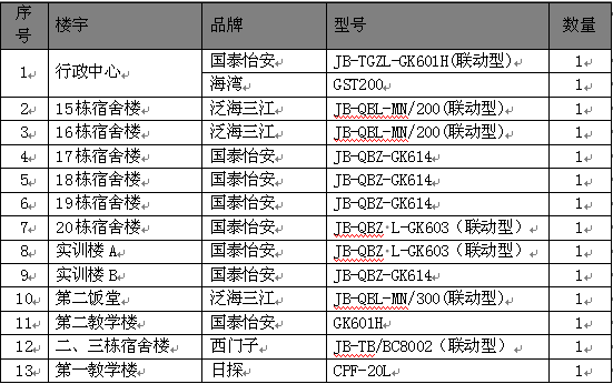 學(xué)?,F(xiàn)有13棟樓宇裝有消防主機(jī)有14套,具體的消防主機(jī)情況詳見下表: