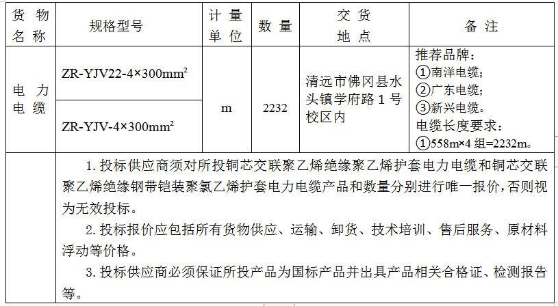 廣州城建職業(yè)學(xué)院對(duì)佛岡校區(qū)電纜采購(gòu)項(xiàng)目進(jìn)行招標(biāo),歡迎符合資質(zhì)要求的生產(chǎn)廠家參與投標(biāo):