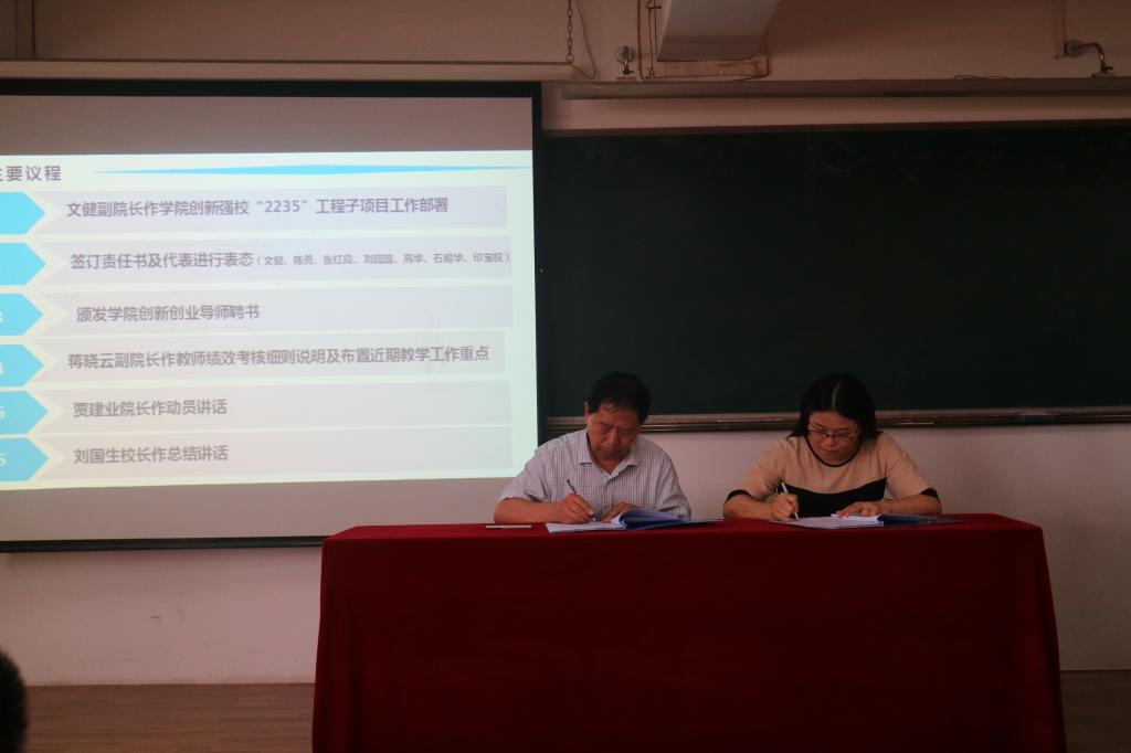 文健副院長簡要介紹了學(xué)院在創(chuàng)新強(qiáng)校“2235”工程中所負(fù)責(zé)的子項(xiàng)目情況,對涉及的子項(xiàng)目進(jìn)行團(tuán)隊(duì)分工及工作部署。隨后,院長與專業(yè)建設(shè)、協(xié)同育人平臺(tái)、品牌專業(yè)建訓(xùn)基地建設(shè)、互聯(lián)網(wǎng)+優(yōu)質(zhì)教學(xué)資源建設(shè)、產(chǎn)學(xué)研基地建設(shè)等子項(xiàng)目團(tuán)隊(duì)負(fù)責(zé)人簽訂了責(zé)任書。