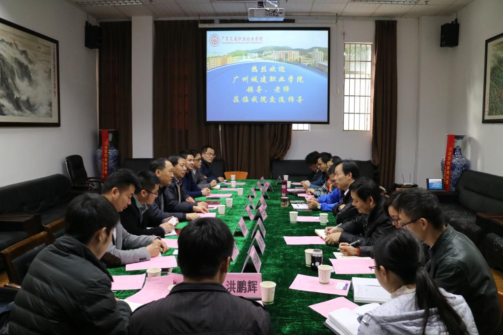 12月29日下午,副校長楊清國率校就業(yè)創(chuàng)業(yè)指導(dǎo)中心主任符裕,建筑工程學(xué)院院長賈建業(yè)、副院長蔣曉云及市政工程教研室相關(guān)教師一行10人赴廣東交通職業(yè)技術(shù)學(xué)院學(xué)習交流,受到該校黨委副書記、紀委書記張國剛和土木工程學(xué)院院長徐凱燕、黨總支書記徐新貴、黨總支副書記余素萍、副院長肖芳及相關(guān)老師的熱情接待。