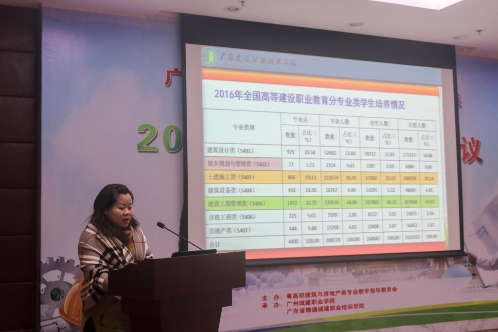 在專題報告環(huán)節(jié)中,教指委秘書長趙瓊梅作廣東省高職院校土建類專業(yè)設置情況報告;廣東華南建筑設計院有限公司副院長姚敏麗結合國內外實際案例,作綠色建筑技術專題講座;廣州市建筑工程學校費騰老師介紹了世界技能大賽參賽經(jīng)驗;廣東建設職業(yè)技術學院楊永峰、廣州番禺職業(yè)技術學院葉雯和廣東環(huán)境保護工程職業(yè)學院祝軍權分別圍繞建筑設備工程技術品牌專業(yè)建設、土建類專業(yè)開展現(xiàn)代學徒制人才培養(yǎng)作了經(jīng)驗分享。廣東省精通城建職業(yè)培訓學院蔣曉云副院長向大會匯報了我?,F(xiàn)代建筑公共實訓中心建設情況。隨后,與會代表在蔣副院長的陪同下參觀了現(xiàn)代建筑技術職業(yè)技能公共實訓中心。