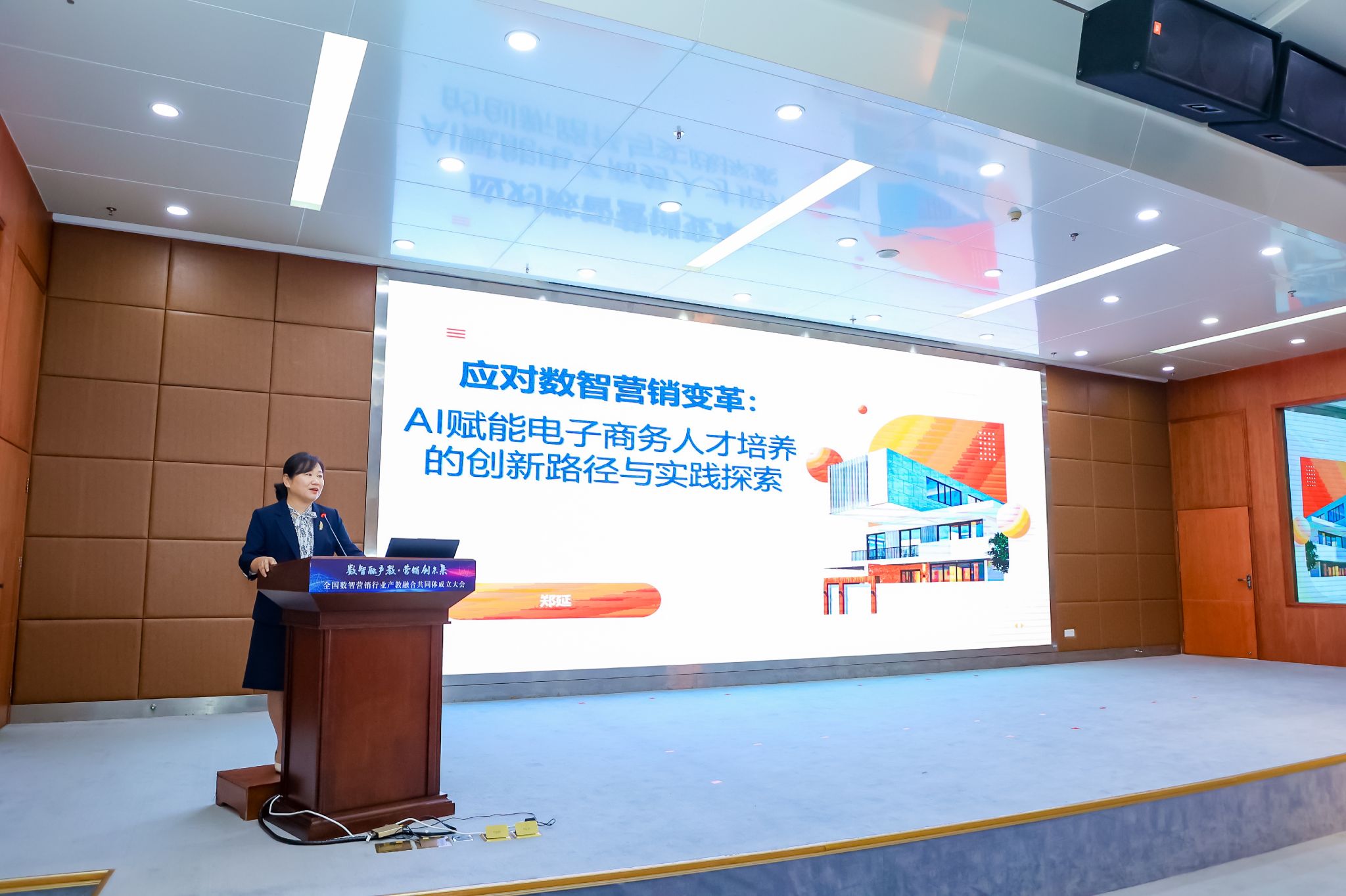 在主旨報告環(huán)節(jié),全國電子商務(wù)職業(yè)教育教學(xué)指導(dǎo)委員會鄭延教授以《應(yīng)對數(shù)智營銷變革:AI賦能電子商務(wù)人才培養(yǎng)的創(chuàng)新路徑與實踐探索》為題,深入解讀了AI技術(shù)對電子商務(wù)人才培養(yǎng)體系的重塑價值,提出了“政策-資源-實施”三維保障體系,為共同體構(gòu)建適配行業(yè)需求的人才培育標(biāo)準(zhǔn)指明了方向。