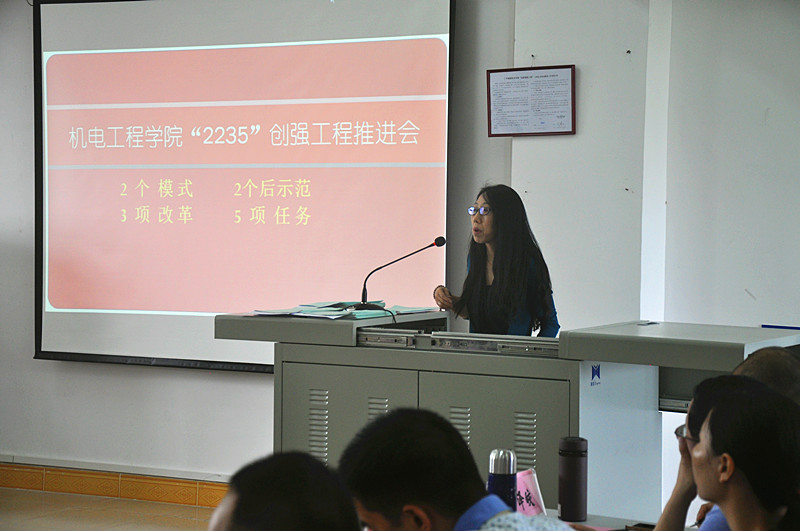 劉校長(zhǎng)指出,機(jī)電工程學(xué)院作為“年輕的老學(xué)院”,雖然成立時(shí)間短,但基礎(chǔ)扎實(shí),希望能緊抓機(jī)遇,充分發(fā)揮自身優(yōu)勢(shì),進(jìn)一步壯大學(xué)院實(shí)力。并肯定了學(xué)院在推進(jìn)創(chuàng)新強(qiáng)?!?235”工程建設(shè)過程中提出的“院長(zhǎng)-副院長(zhǎng)—教研室主任—骨干教師—教師”五層次層層推進(jìn)責(zé)任制,將工作任務(wù)具體落實(shí)到人,也讓教師們清晰了解自己所參與的項(xiàng)目。同時(shí)對(duì)學(xué)院推進(jìn)“創(chuàng)新強(qiáng)校”工作、提高人才培養(yǎng)質(zhì)量提出三點(diǎn)希望,一是希望讓“產(chǎn)學(xué)結(jié)合”走在前面。在“理實(shí)一體”教學(xué)上學(xué)院已成功邁出第一步,希望接下來要“產(chǎn)出來”,做出成效,真正做到“產(chǎn)學(xué)結(jié)合”。二是將雙創(chuàng)教育融入專業(yè)教育,把創(chuàng)新創(chuàng)業(yè)改革的紅利惠及師生。希望學(xué)校創(chuàng)新創(chuàng)業(yè)教育示范校的“后示范”建設(shè)能夠在學(xué)院開花結(jié)果,能夠融入專業(yè)人才培養(yǎng)方案,讓師生受益。三是團(tuán)隊(duì)攻關(guān)要形成合力。教研室作為學(xué)校教學(xué)、科研的基層組織,在建設(shè)方面要出經(jīng)驗(yàn)、出成果、出效益,教研室主任要增強(qiáng)團(tuán)隊(duì)凝聚力,自上而下、目標(biāo)一致、協(xié)同作戰(zhàn)、凝聚共識(shí)向前走。
