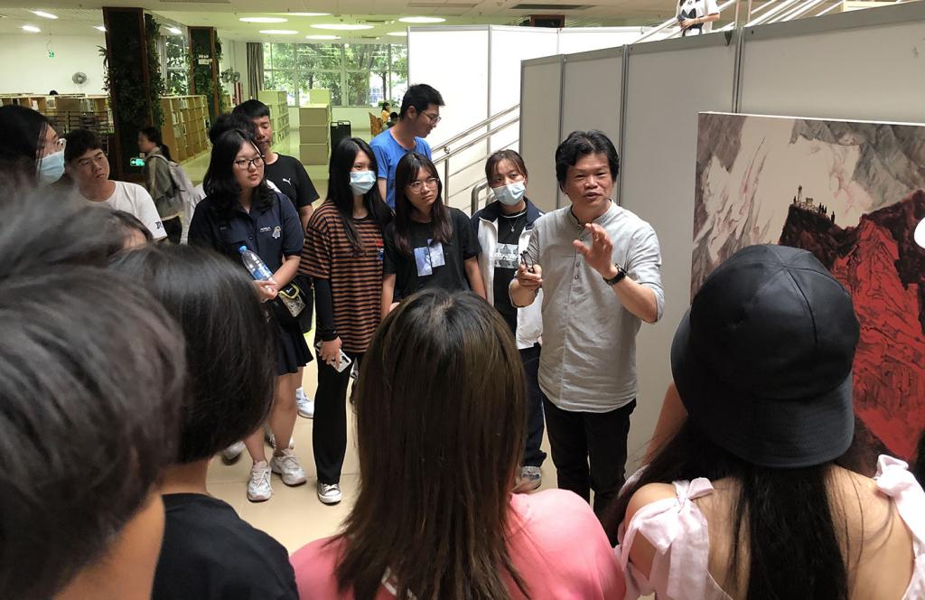 展覽現場,劉境奇教授積極推行課程思政“城建模式”的“三個一”課程(1個展覽現場新生專業(yè)教育課、1個寫生路上的課程思政、1個紅色文創(chuàng)專題設計課),把教書和育人有機結合起來。他結合學院專業(yè)優(yōu)勢與特點,充分利用藝術作品展覽資源,圍繞學生關注的熱點、興趣點,將“品紅色藝術,弘城建文化--藝術教師作品展”與新生專業(yè)教育有機融合,運用展覽的形式開展教學。