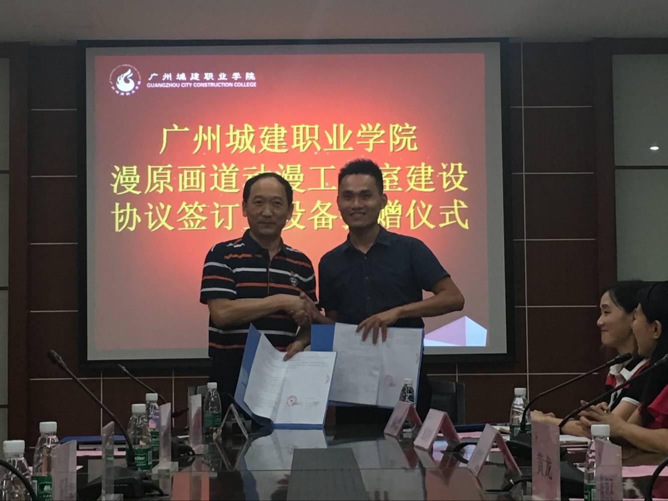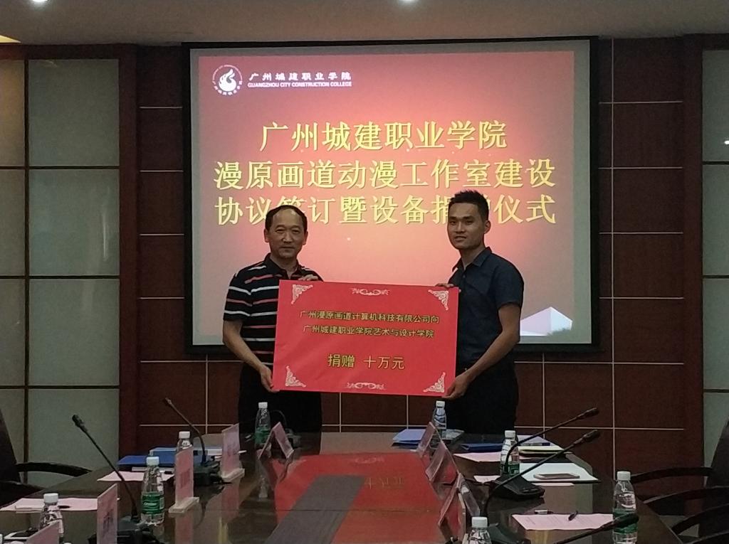 會上,王媚莎代表學校對企業(yè)近兩年來對專業(yè)發(fā)展的大力支持表示了感謝,并對工作室未來的發(fā)展寄予厚望,希望校企雙方能發(fā)揮各自的優(yōu)勢,在產(chǎn)學研平臺的建設(shè)上開展更好的合作。廣州漫原畫道計算機科技有限公司陳智圣總經(jīng)理向與會領(lǐng)導(dǎo)介紹了公司的綜合實力,并就工作室發(fā)展和未來合作的方向進行了詳細的分析與規(guī)劃。楊清國對企業(yè)的規(guī)劃給予了充分的肯定,同時期望企業(yè)的加入能更好地促進動漫制作技術(shù)專業(yè)參與科創(chuàng)杯與互聯(lián)網(wǎng)+等比賽,在省賽和國賽上獲得優(yōu)異的成績。隨后,楊清國與陳智圣總經(jīng)理作為雙方代表簽訂了《工作室共建協(xié)議》,并就價值10萬設(shè)備捐贈進行了現(xiàn)場簽約儀式。