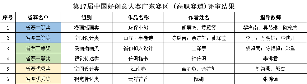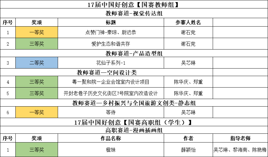 我校謝石黨老師作品《點(diǎn)贊門(mén)神-秦瓊、尉遲恭》《愛(ài)護(hù)生態(tài)和諧共存》分獲國(guó)賽教師組視覺(jué)傳達(dá)組一等獎(jiǎng)和三等獎(jiǎng);吳芯琳老師作品《等待》《花仙子系列-1》分獲國(guó)賽教師組鄉(xiāng)村振興與全國(guó)旅游文創(chuàng)類(lèi)-靜態(tài)組一等獎(jiǎng)和產(chǎn)品造型組二等獎(jiǎng);陳華慶、鄭重老師作品《粵—聚和院—企業(yè)會(huì)館室內(nèi)設(shè)計(jì)項(xiàng)目》《開(kāi)封老巷子歷史文化街區(qū)7號(hào)院室內(nèi)改造設(shè)計(jì)》分獲國(guó)賽教師組空間設(shè)計(jì)類(lèi)和文化遺產(chǎn)保護(hù)類(lèi)三等獎(jiǎng)。此外,由吳芯琳、黎海南、陳艷梅指導(dǎo)的薛穎怡同學(xué)作品《橙妹》獲國(guó)賽高職組漫畫(huà)插畫(huà)組三等獎(jiǎng),是我校唯一一個(gè)國(guó)賽獲獎(jiǎng)的學(xué)生作品。