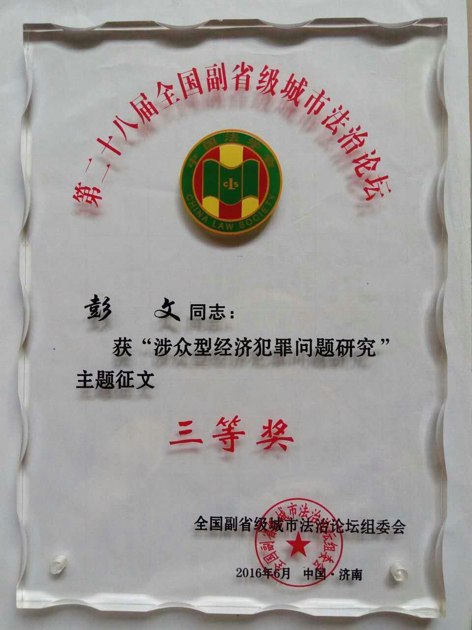 據(jù)悉,全國副省級城市法治論壇是中國法學(xué)會七大區(qū)域法治論壇之一,第二十八屆法治論壇由沈陽、大連、長春、哈爾濱、南京、杭州、寧波、廈門、濟(jì)南、青島、武漢、廣州、深圳、成都、西安15個副省級城市法學(xué)會共同主辦,濟(jì)南市法學(xué)會承辦。本屆論壇主題是“防范打擊涉眾型經(jīng)濟(jì)犯罪”,共征集到論文917篇。歷經(jīng)初評、學(xué)術(shù)不端檢測、終評,最終評選出一等獎10篇,二等獎25篇,三等獎42篇,共77篇獲獎作品。面對強(qiáng)手如林的競爭,彭文老師仍能從容斬獲大獎,體現(xiàn)了我校教師優(yōu)秀的科研素養(yǎng)和良好的精神風(fēng)貌,也進(jìn)一步擴(kuò)大了我校的影響。