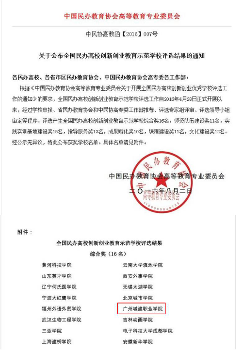 根據(jù)中國民辦教育協(xié)會高等教育專業(yè)委員會《關于公布全國民辦高校創(chuàng)新創(chuàng)業(yè)教育示范學校評選結果的通知》(中民協(xié)高教函〔2016〕007號),我校獲得“全國民辦高校創(chuàng)新創(chuàng)業(yè)教育示范學校綜合獎”,成為全國16所獲此殊榮的民辦高校之一。